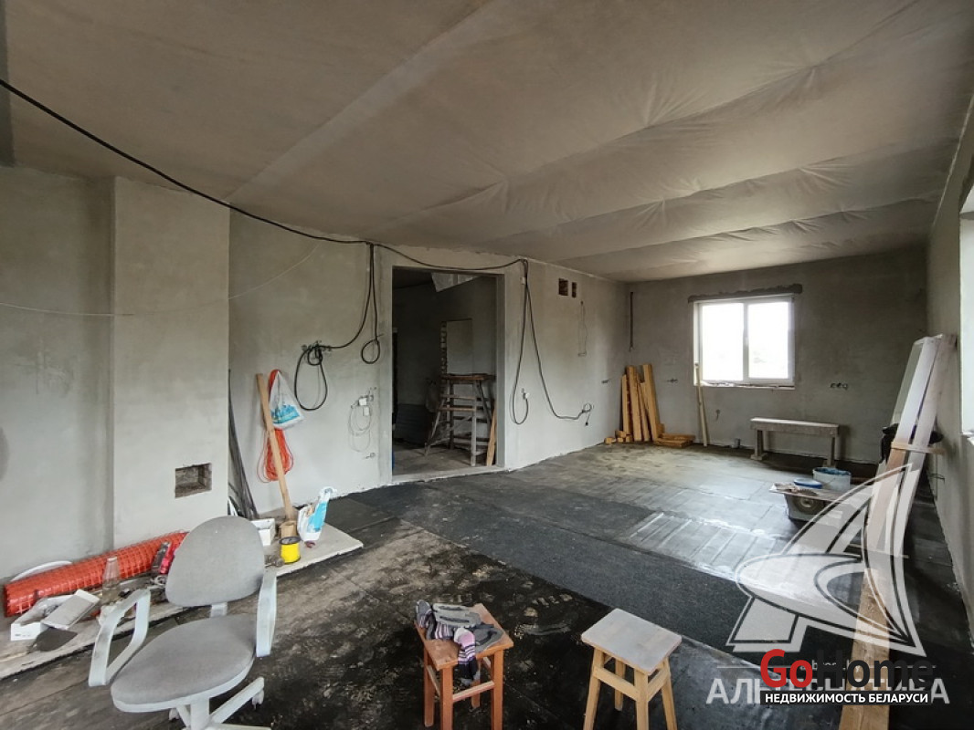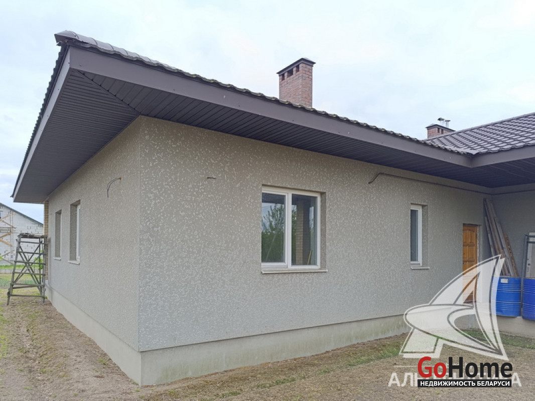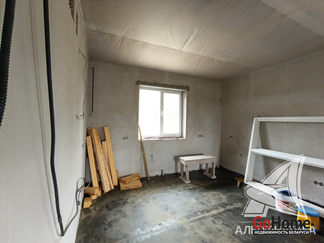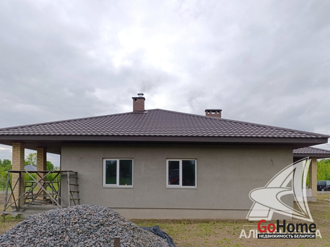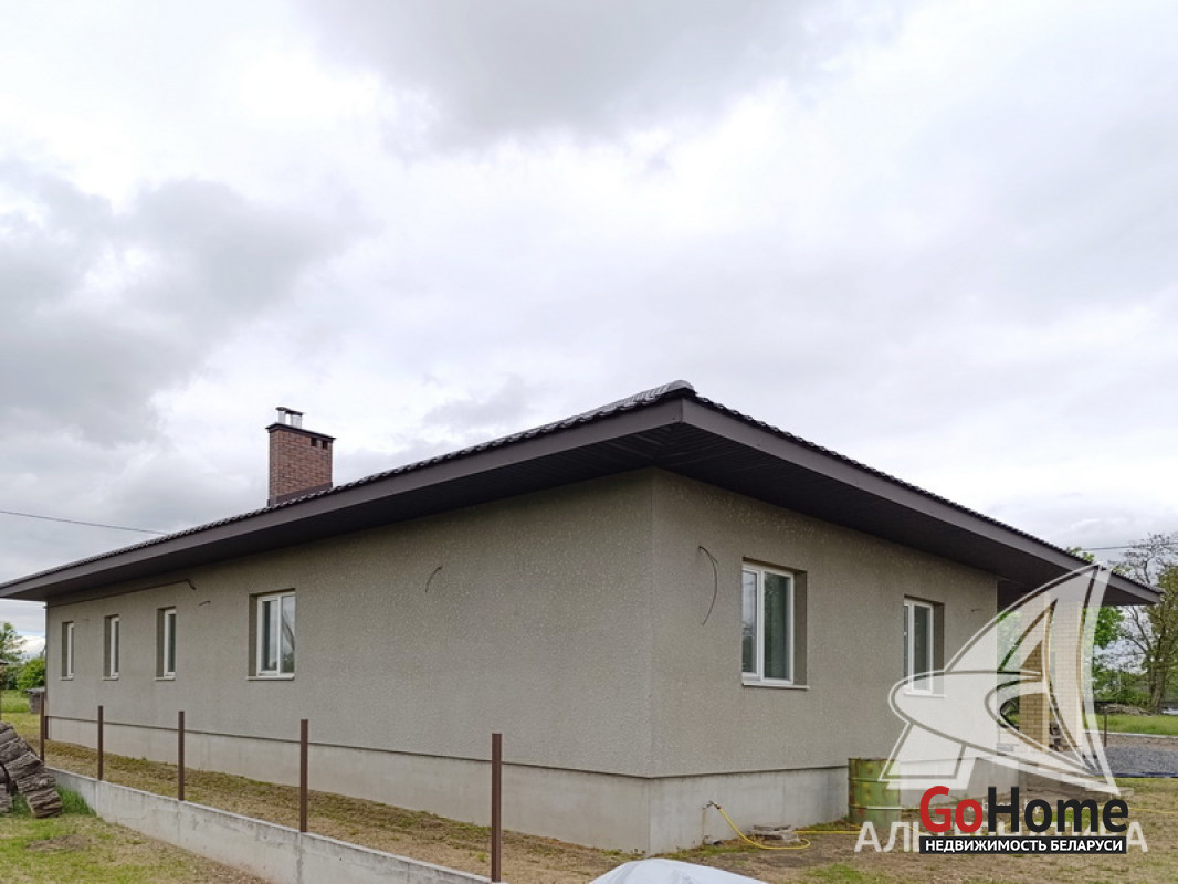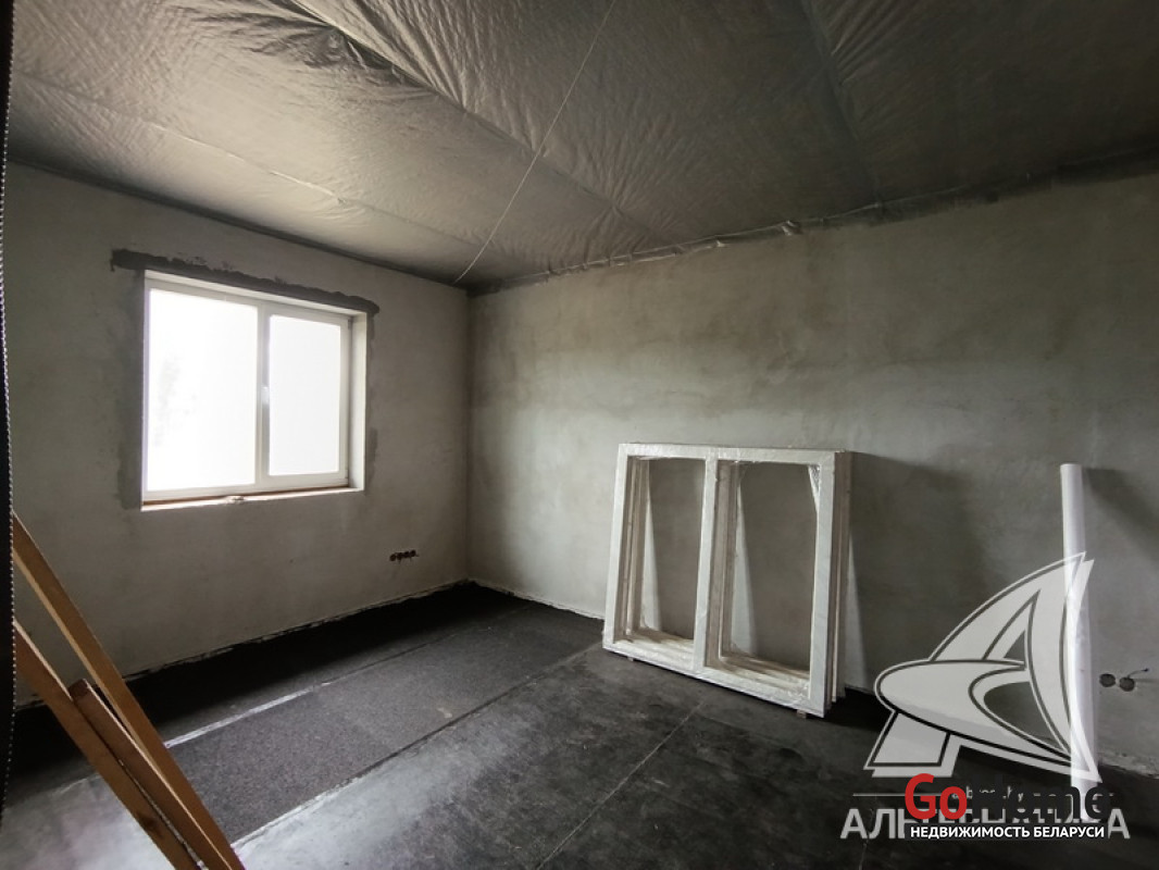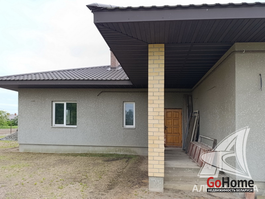 Дом под чистовую отделку в Брестском р-не.2022 г.п. 1 этаж. Общ.СНБ - 149,4 кв.м, общ.- 82,5 кв.м, жил.- 13,5 кв.м, кух.- 13,5 кв.м. 4 комнаты, высота потолка - 2,80 м.