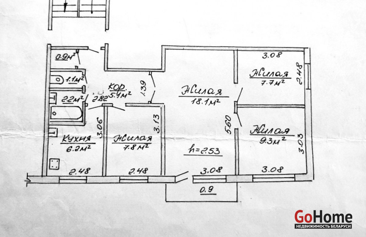 Общая площадь-58,3 кв.м., жилая площадь– 42,8 кв.м.: проходной зал-18,1 кв.м, спальные комнаты-7,7 кв.м., 9,3 кв.м., 7,8 кв.м. Кухня-6,2 кв.м. Туалет (1,1 кв.м.) и ванная комната (2,2 кв.м.)-раздельные. Внутренний коридор-5,1 кв.м. Имеется оборудованная кладовая комната- 0,9 кв.м. Балкон (0,9 кв.м.) остеклён рамами ПВХ. Выход на балкон из зала. Высота стен-2,53м.