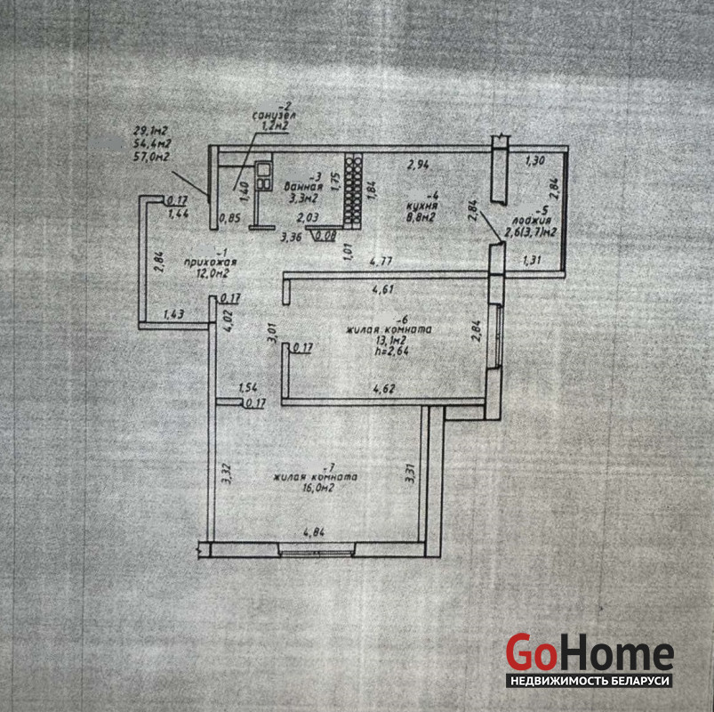 2-комнатная, 63.1/28.1/9.2 м2, Этаж 3 из 10, 1997 г.