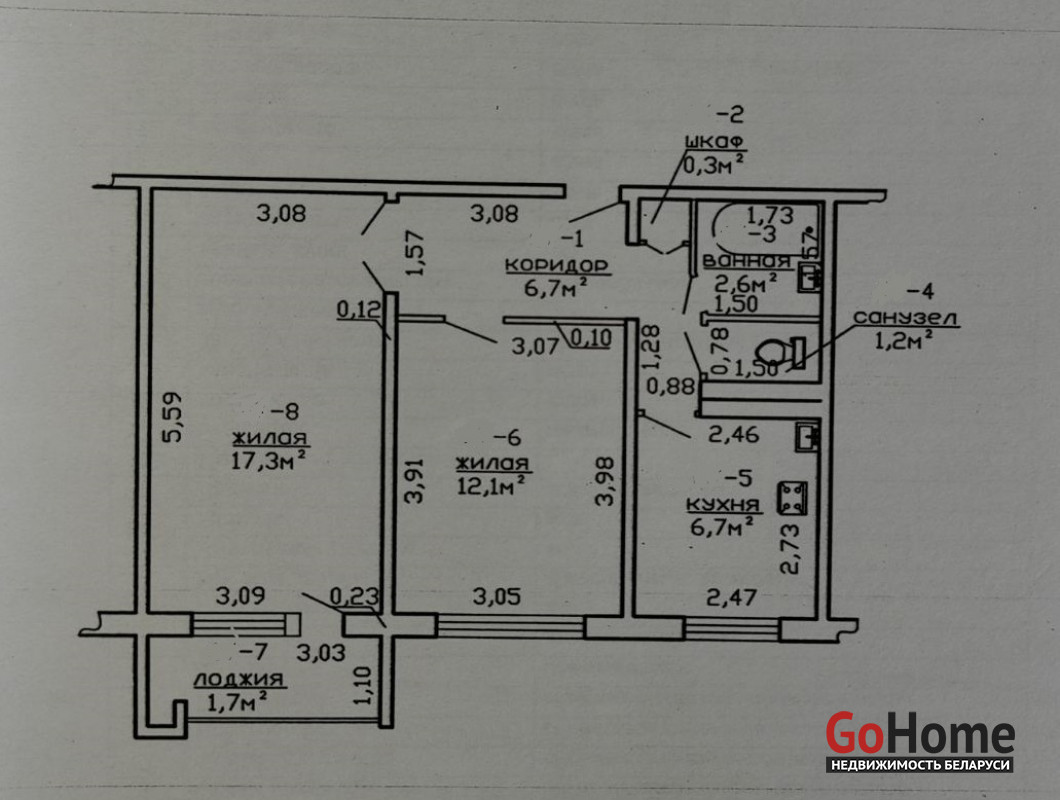 Комнаты изолированные площадью 17,3 и 12,1 кв.м. Окна ПВХ, входная металлическая дверь, межкомнатные двери МДФ, на полу ламинат, линолеум, плитка. Квартира не угловая. Установлены приборы учёта воды, электричества и тепла, телефон, домофон, подвальное помещение. При продаже остаётся встроенная кухня.