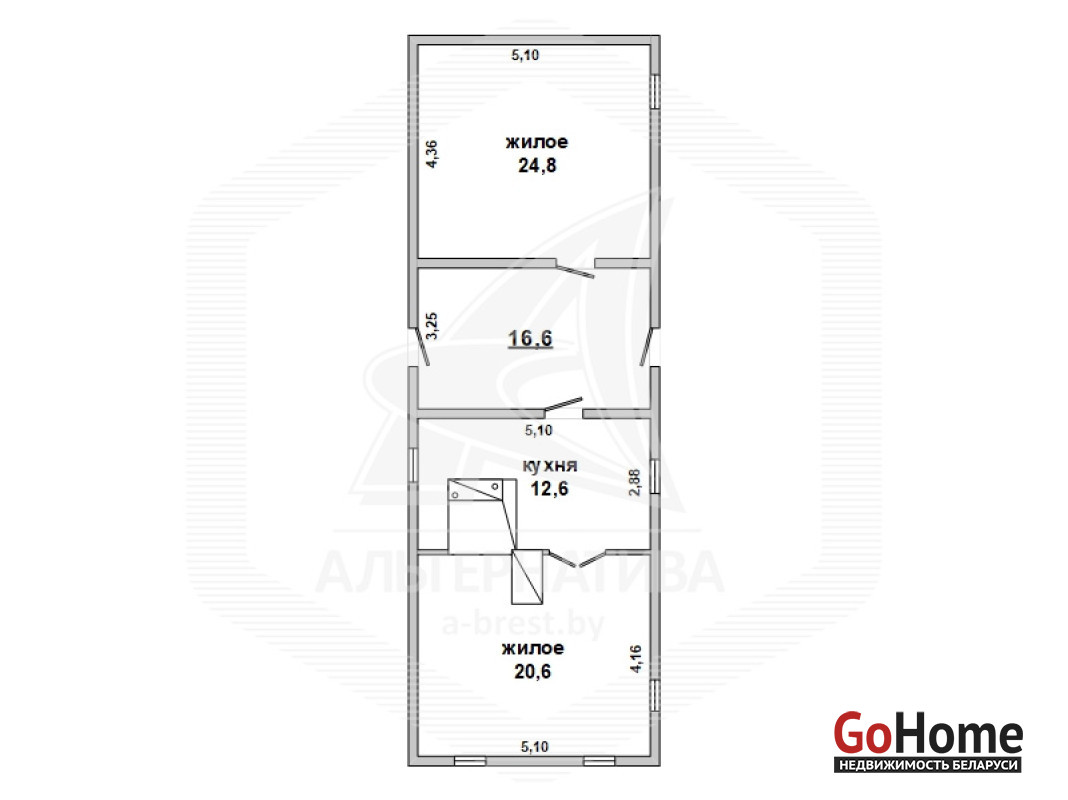 Жилой дом в Малоритском р-не. 1 этаж, мансарда. Общ.СНБ - 74,6 кв.м, общ.- 74,6 кв.м, жил.- 45,4 кв.м, кух.- 12,6 кв.м, 2 комнаты, высота потолка - 2,50 м.