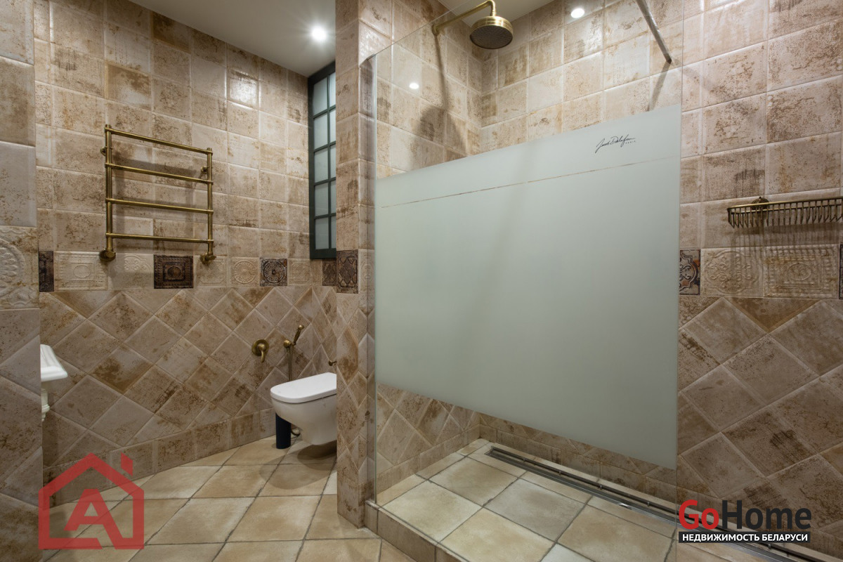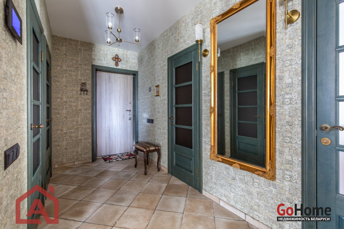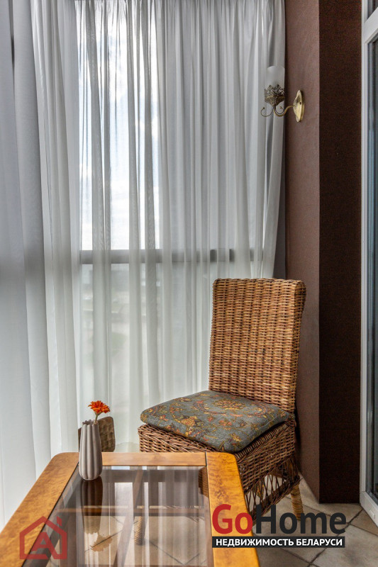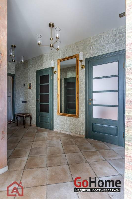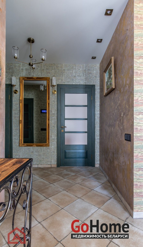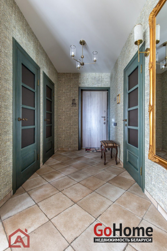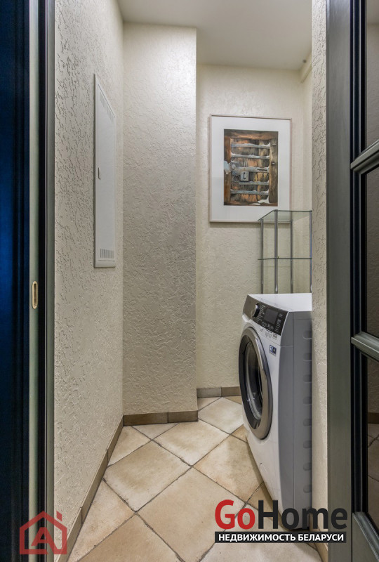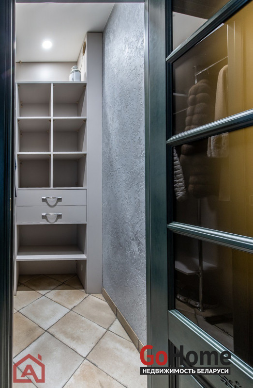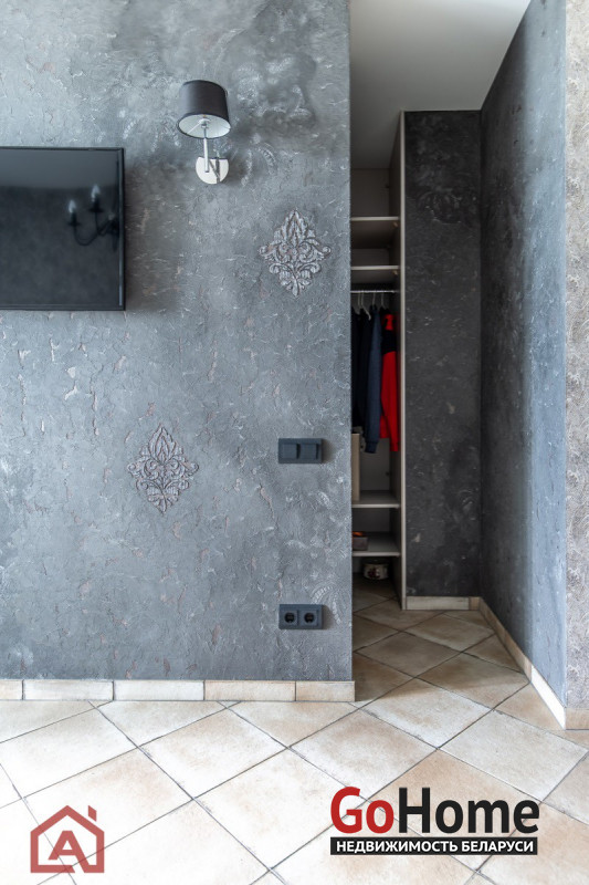 В квартире предусмотрено множество мест для хранения одежды, а также установлена дорогая сантехника из латуни. Стены оформлены дорогими сатиновыми обоями, а в спальне используется мешковина, создающая уютную атмосферу. Также по всей квартире разведена акустическая система Harman Kardon для отличного звучания.