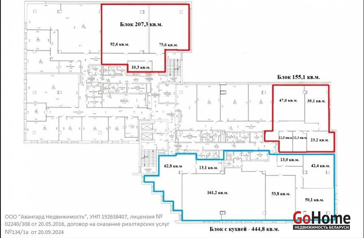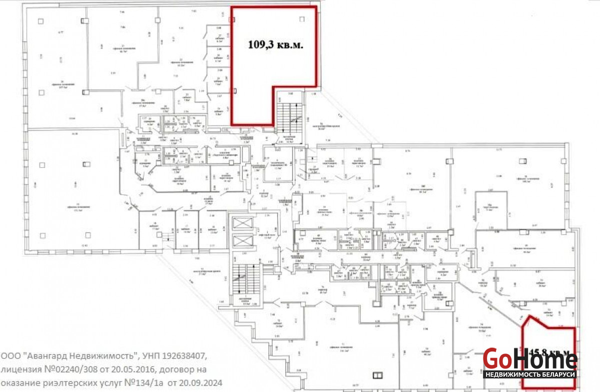помещения на 1-м этаже с отдельным входом. Включает в себя пространство “open space”, 3 помещения с выводом воды, отдельный санузел; офиса площадью 109,3 м2. Формат - “open space”; офиса площадью 45,8 м2; офисного блока общей площадью 207,3 м2. Включает в себя два кабинета и комнату для переговоров; офисного блока с кабинетами от 11,3 м2 до 47 м2. Общая площадь - 155,1 м2; офисного блока общей площадью 444,8 м2. Включает в себя кабинеты, комнаты для переговоров, помещение под кухню, отдельные санузлы. Общие характеристики объекта: