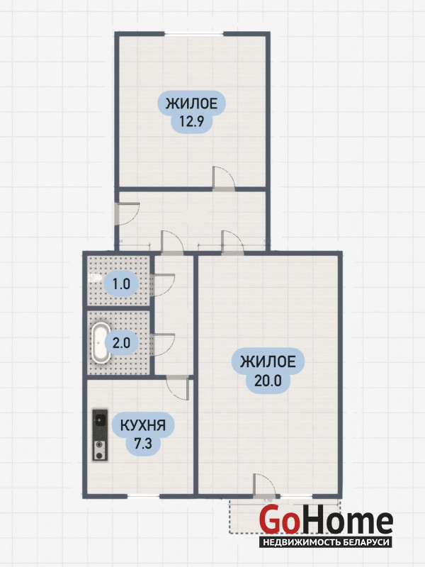 Общая площадь 52.3 м. кв., жилая 32.9 м. кв., кухня 7.3 м. кв. Квартира находится на 1 этаже 3 этажного кирпичного дома, построенного в 1972 году.