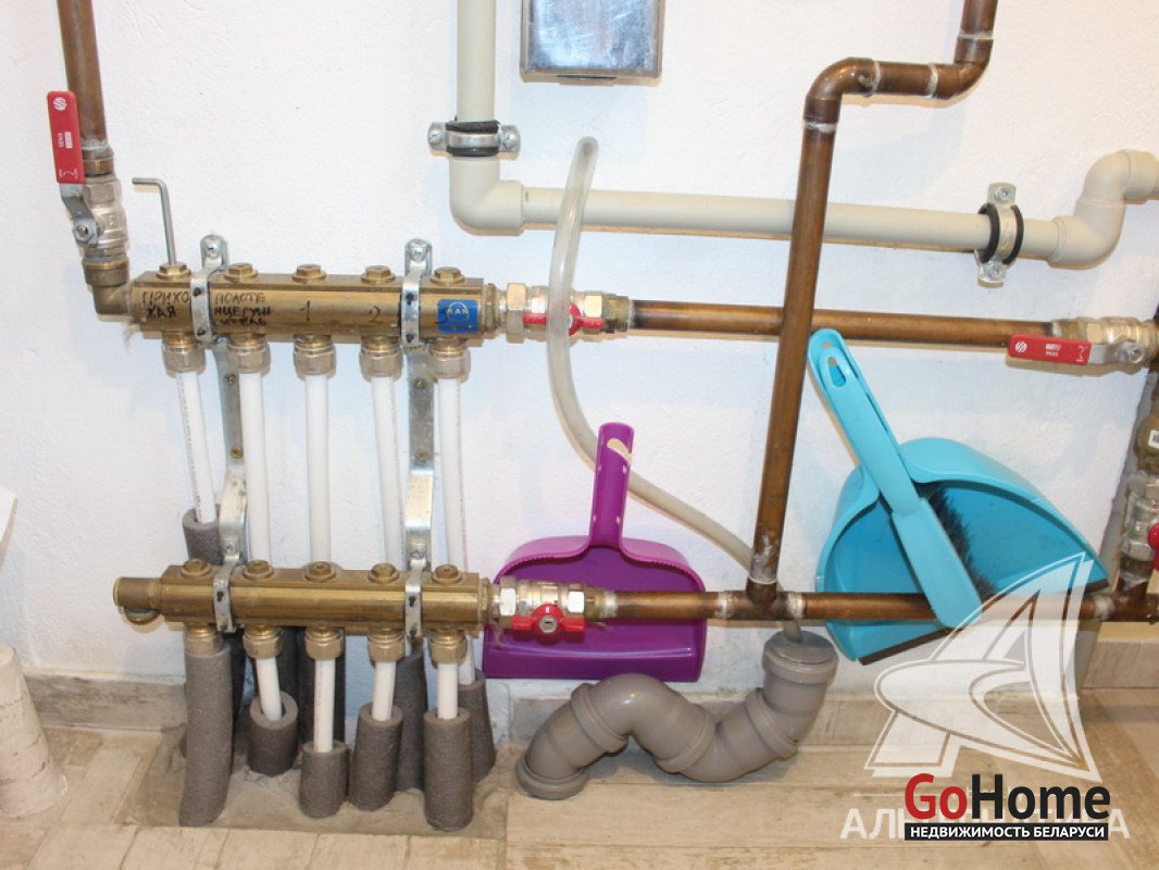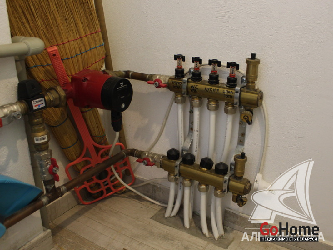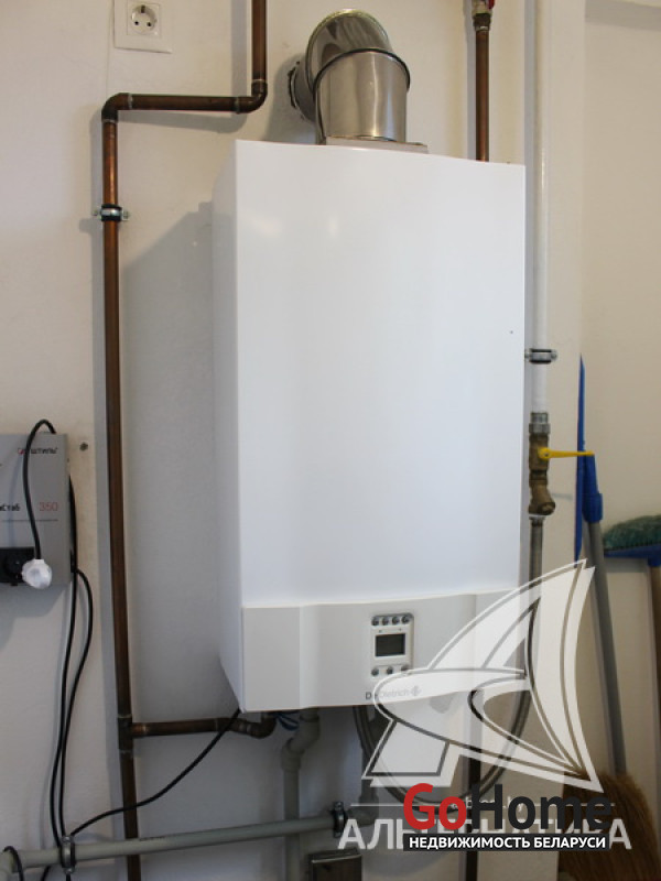 Коммуникации: отопление - газовый котел, газ - централизованный (в доме), водоснабжение - централизованный водопровод и скважина на участке, электричество - централизованное, канализация - централизованная.