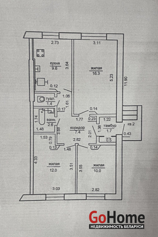 Общая площадь квартиры составляет 59,3 кв.м., из которых жилая площадь — 38,3кв.м., а кухня занимает 9,6 кв.м.