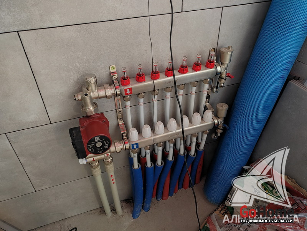 Коммуникации: отопление - газовый котел, газ - централизованный (в доме), водоснабжение - водонапорная башня, скважина и гидрофор, электричество - централизованное, канализация - автономная.