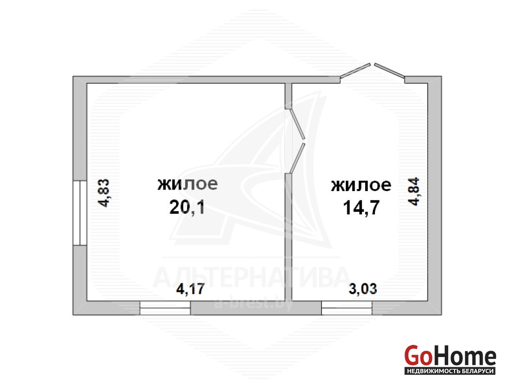 Тех. хар-ка продаваемой части дома: 2 комнаты. Жил.- 34,8 кв.м, кух. - 4,6 кв.м.