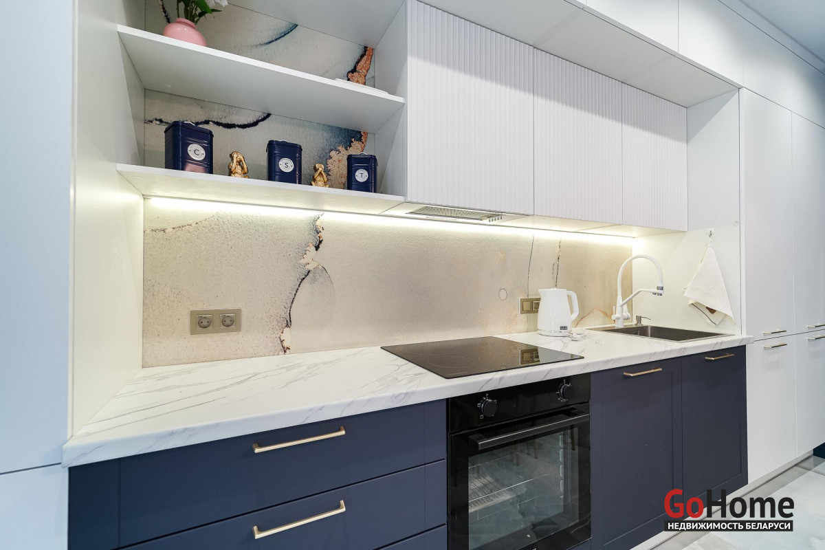 Кухня в сочетании цвета индиго и белого с вертикальными линейными фасадами, оборудована посудомоечной машиной, встроенным холодильником, системой фильтрации воды, встроенная индукционная плита с конвекторной духовкой. Сочетание золота и белого глянцевого камня столешницы в обеденной группе, полностью дополняют весь интерьер квартиры.