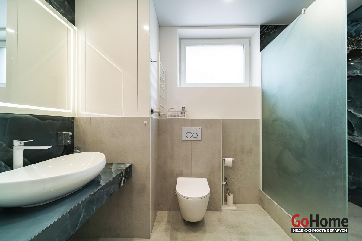 В квартире 2 санузла: оборудованы стиральной машиной, встроенными инсталляциями и облицованы испанской плиткой с глубоким каменным рисунком. В основной ванне установлен тропический душ, со встроеным трапом и перегородкой из закалённого матового стекла. В зеркалах, над накладным умывальником, установлена встроенная подсветка.