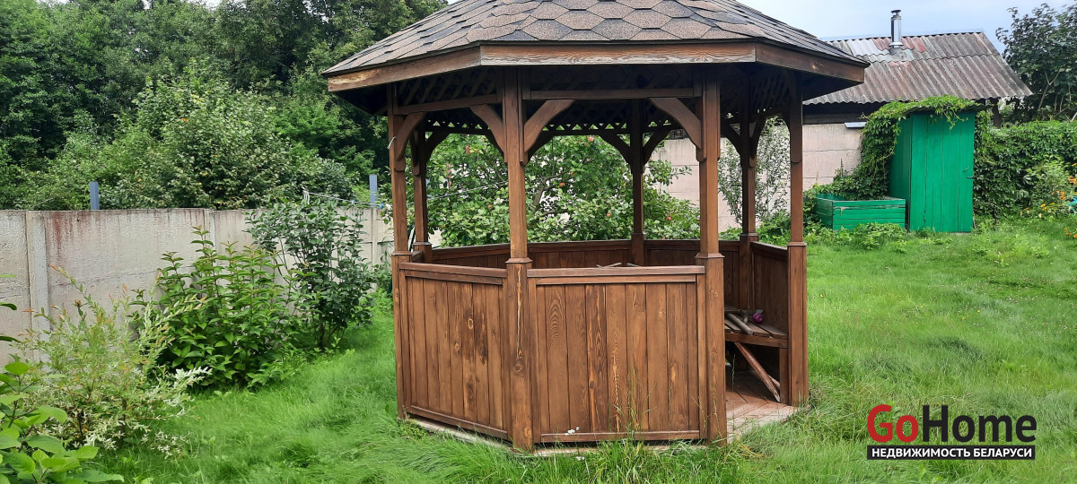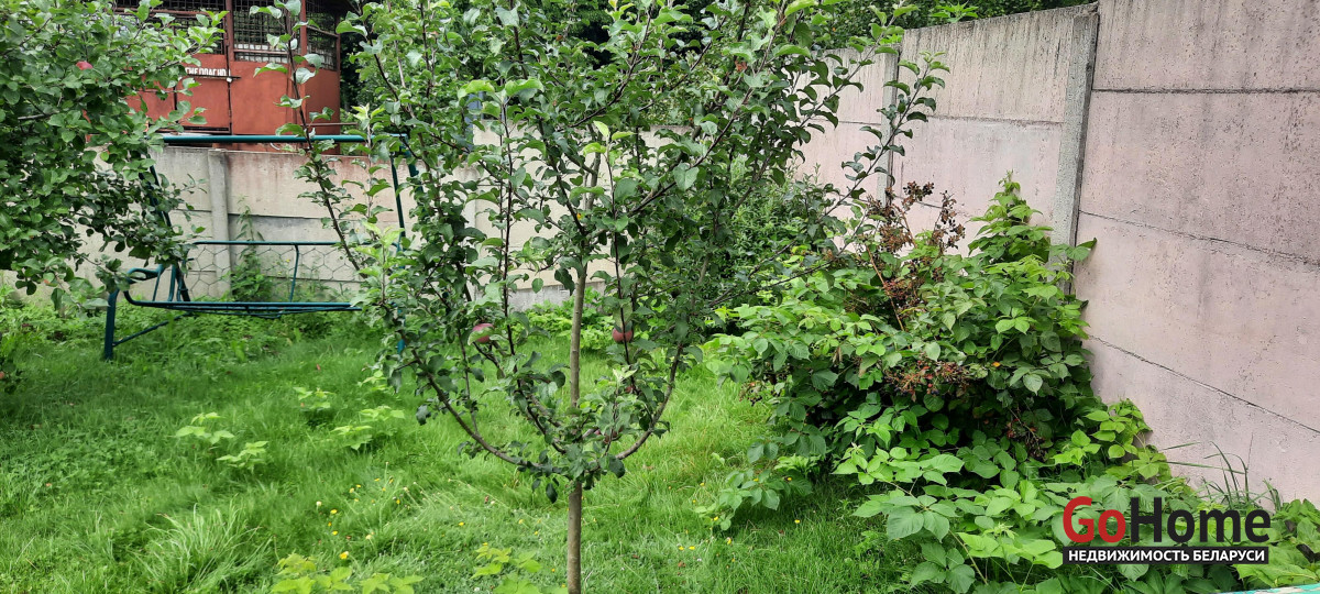 На участок 4.3 сотки всё разумно распланировано - зона отдыха с беседкой, небольшой огород для зелени, сарай, туалет. Зона отдыха засеена газоном, есть яблони, кусты ежевики и др. , множество цветов.