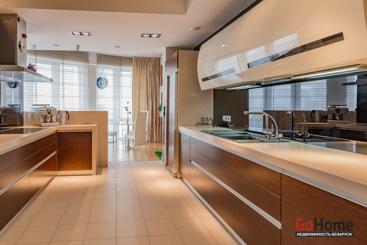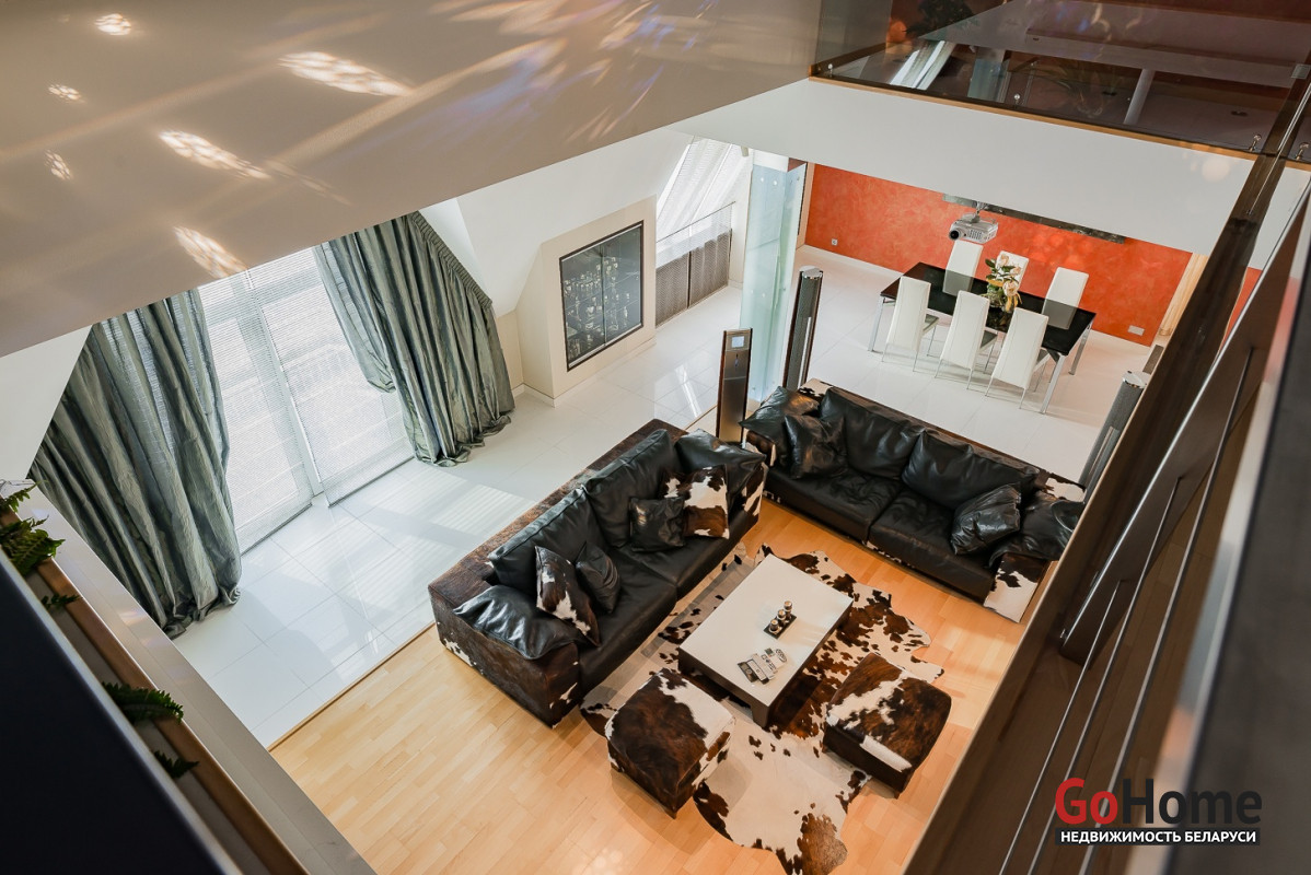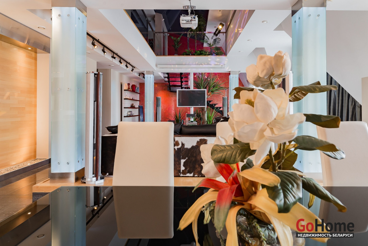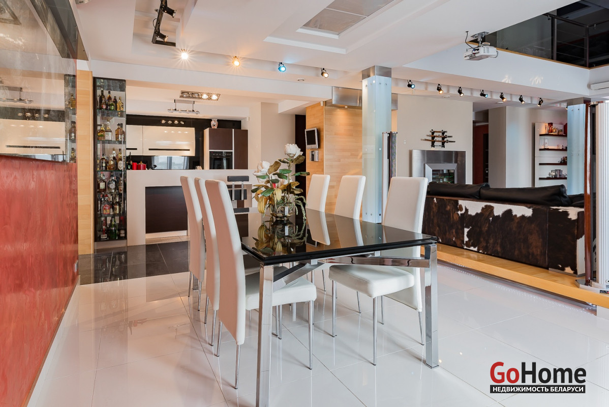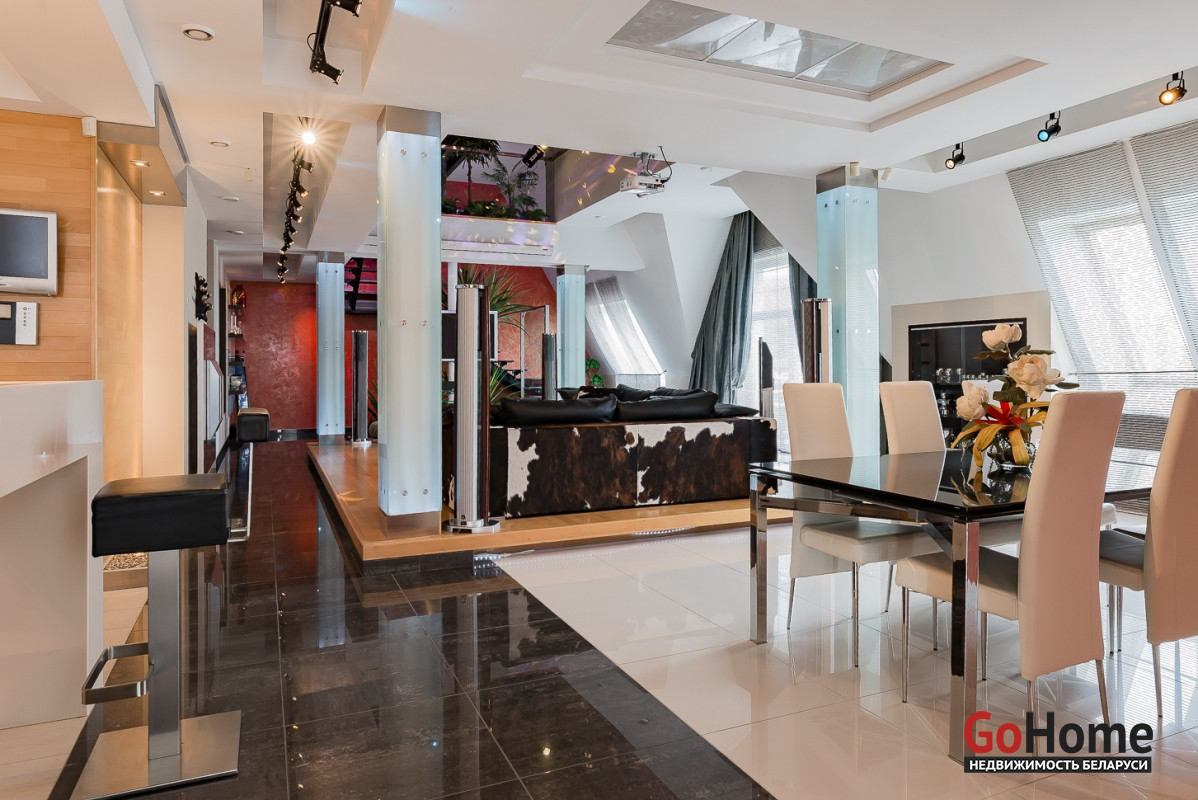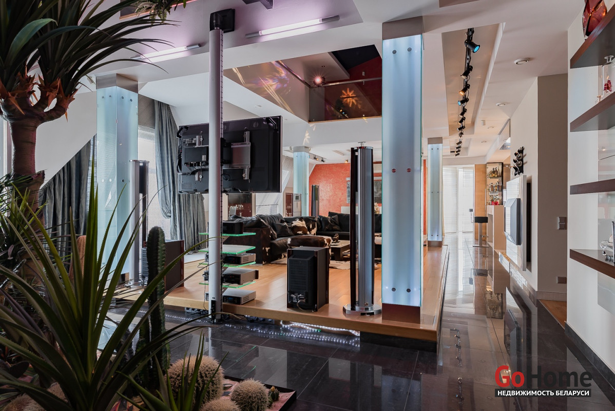Квартира двухуровневая площадью 216 кв.м., снабжена системой "умный дом" (система рекупирации воздуха, система антипротечек, 3 программы настройки освещения по настроению и т.д.). Выполнен ремонт из дорогостоящих импортных материалов, полностью меблирована (эксклюзивная мебель известных американских брендов).