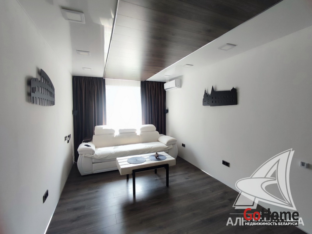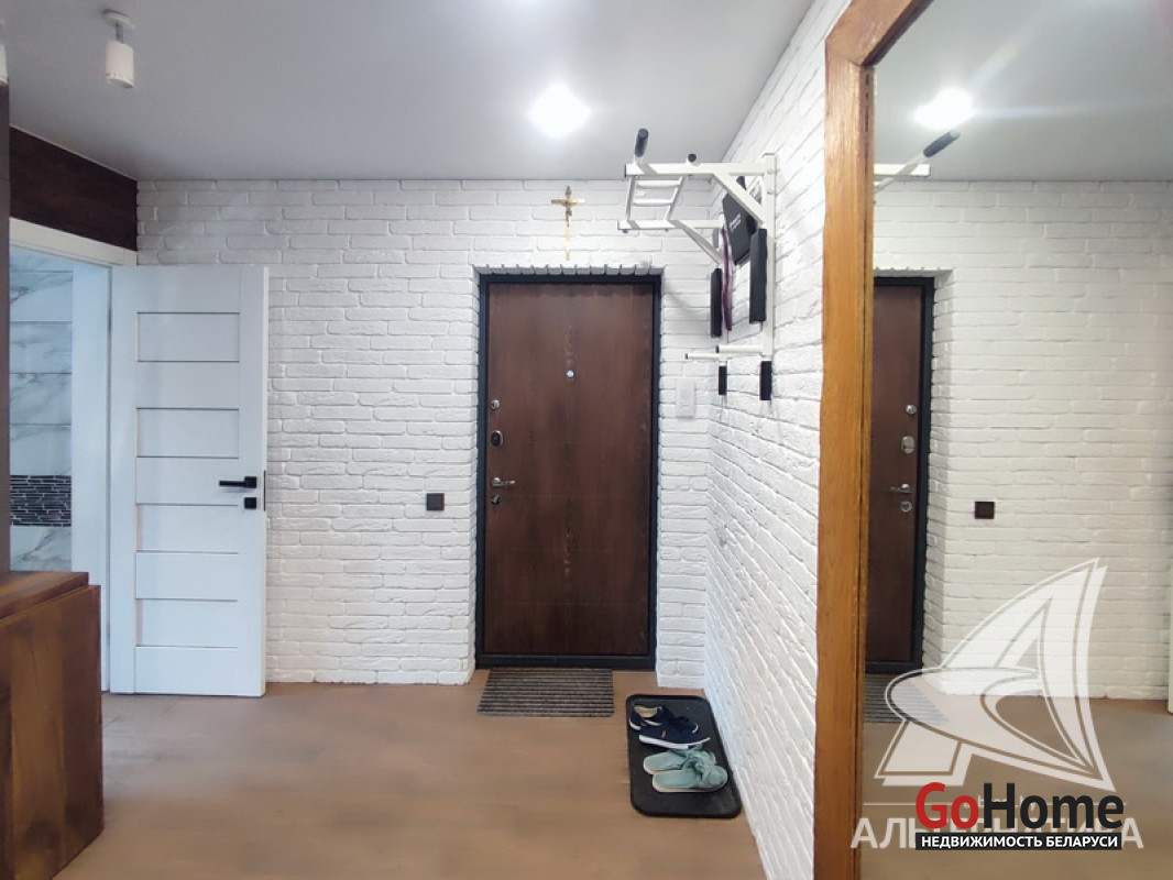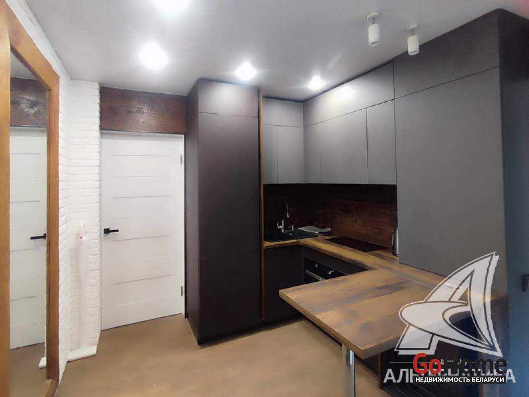 1-комнатная квартира, г. Кобрин, ул. Калинина, 1986 г.п., 1 / 5 панель, 30,6 / 30,6 / 15,9 / 7,7, санузел раздельный, стеклопакеты, межкомнатные двери - экошпон, входная дверь металлическая, комбинированные (плюс ламинат) многоуровневые потолки с разноплановой системой освещения, полы - ламинат (положен на стяжку), стены - декоративная окраска и отделка камнем, в санузле современная плитка, заменена сантехника, заменен полотенцесушитель, угловая ванна (джакузи), заменены сантехнические трубы (металл), установлены новые радиаторы, кондиционер, домофон. Кухонный гарнитур, варочная поверхность, обеденная группа (стол, два стула), вытяжка, встроенный шкаф (в санузле). Квартира с хорошим ремонтом. Высокий цоколь. Чистый подъезд. Лот - 251132