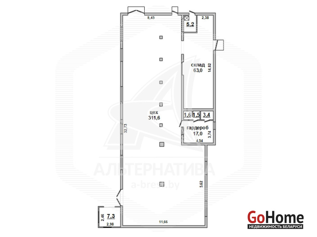 Производственно - складское здание в собственность общей площадью 410,6 кв.м, расположенное на земельном участке площадью 0,0786 га в промышленной зоне города Бреста (р - н ул. Писателя Смирнова). Отдельно стоящее капитальное строение (назначение - здание специализированное для ремонта и (или) технического обслуживания автомобилей). Состоит из производственного цеха площадью 310 кв.м и склада (63 кв.м). Есть подсобное помещение, комната приема пищи, душевая, отдельный санузел. Высота потолков - 3,02 м. Технические характеристики здания: фундамент бетонный, полы наливные, стены кирпичные, перекрытия - плита железобетонная, крыша - шифер, окна - ПВХ. Коммуникации: электроэнергия - 220, 380 Вт (входная мощность - 10 кВт, кабель на 100 кВт), отопление на твердом топливе (собственная котельная), водоснабжение центральное, канализация местная. Земельный участок предоставлен собственнику в долгосрочную аренду для обслуживания здания (до 31.10.2072 г.). Асфальтные подъездные пути. Оборудование на фото НЕ ВХОДИТ В СТОИМОСТЬ ОБЪЕКТА И НЕ ПРОДАЕТСЯ. Аренда здания НЕ РАССМАТРИВАЕТСЯ. Лот - 251120