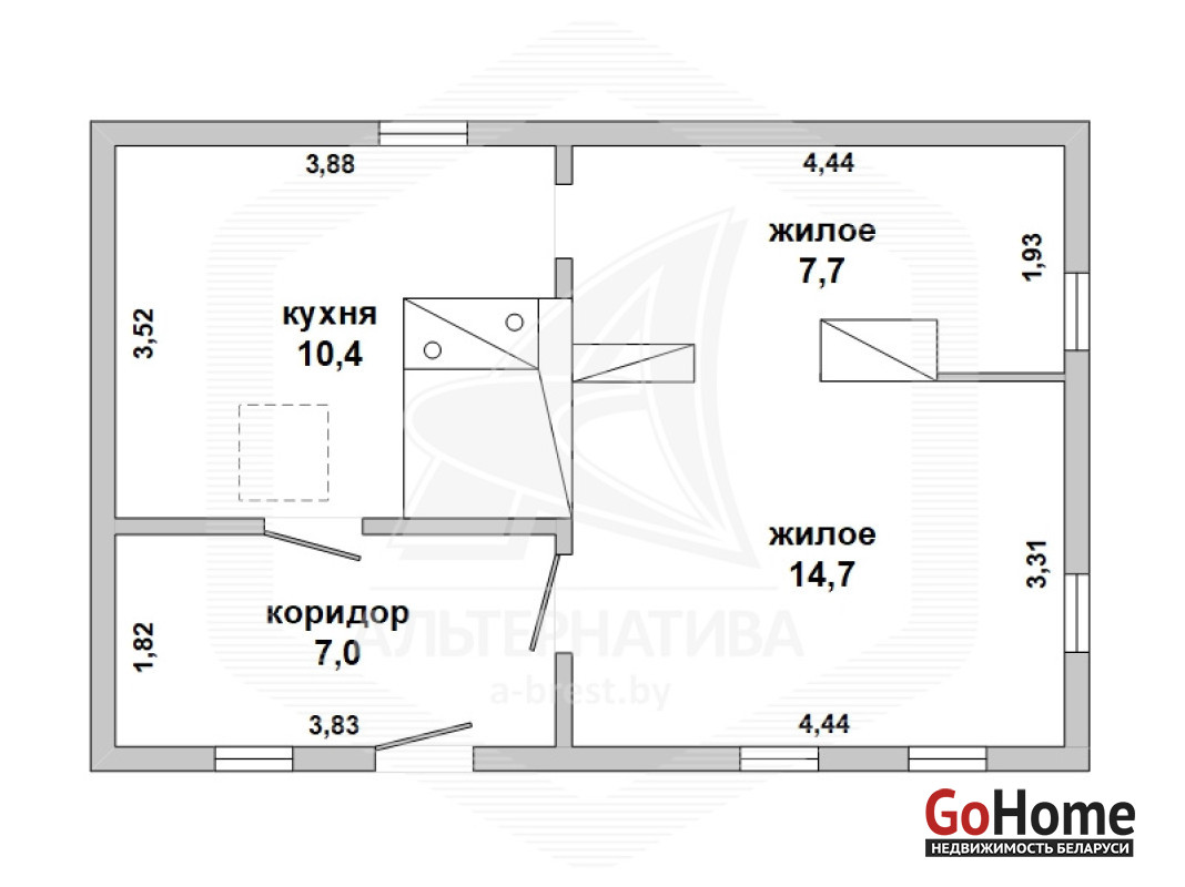 Жилой дом в Брестском р-не. 1 этаж. Общ.СНБ - 39,8 кв.м, общ.- 39,8 кв.м, жил.- 22,4 кв.м, кух.- 10,4 кв.м. 2 комнаты, высота потолка - 2,30 м.