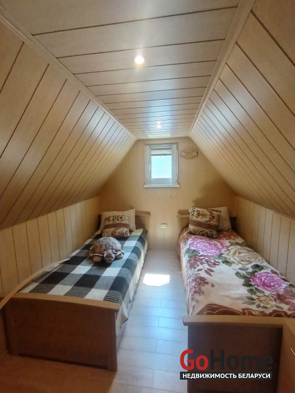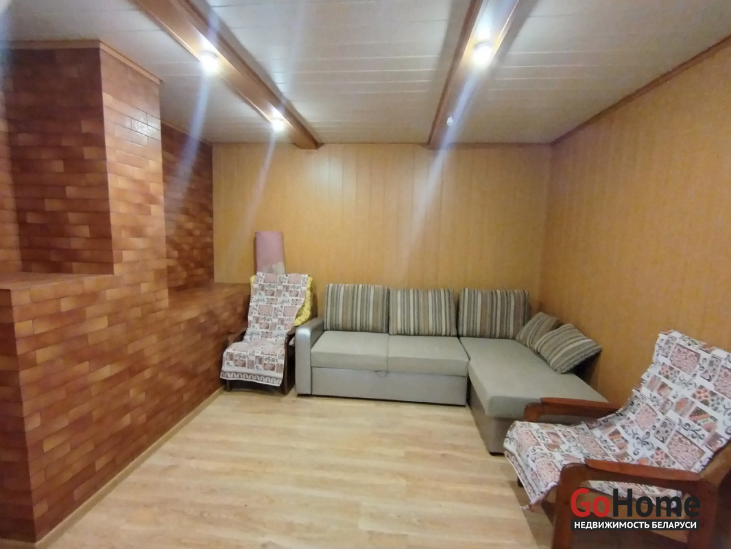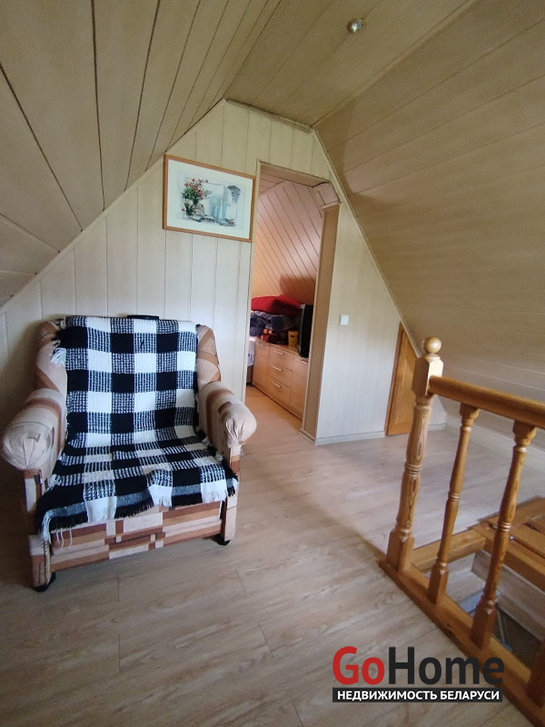 * Внутри дома: Просторная гостиная с удобным угловым диваном и креслами, уютная кухня, на мансардном этаже несколько спальных мест.