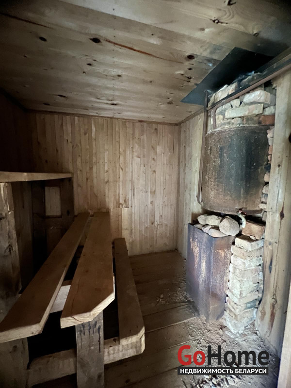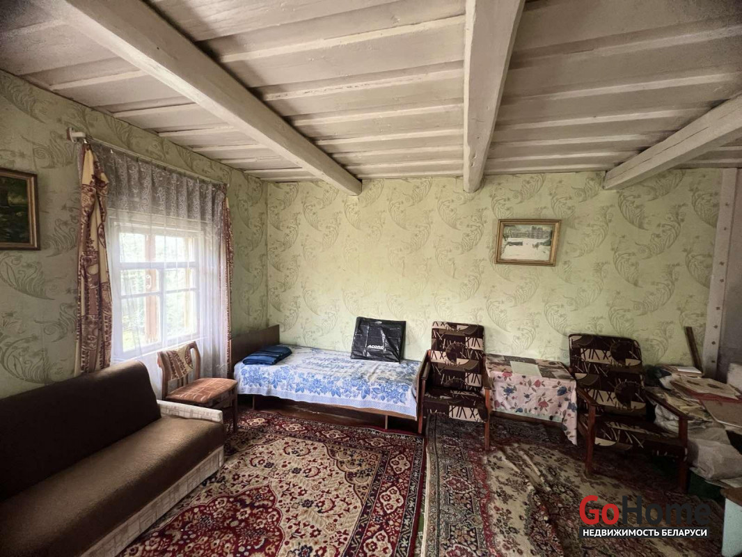 В доме сохранена печь с лежанкой. Водоснабжение из колодца. В доме одна просторная комната и кухня. На участке растут яблони, вишни, груша, туи. Участок общей площадью 0,2500 га. Квадратной формы крайний. Из построек: сарай, гараж, погреб, баня. Вода в баню проведена из колодца.