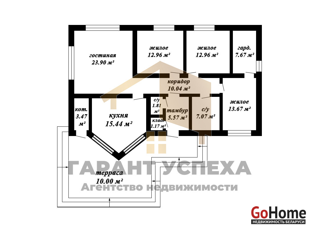 Общая площадь – 149,1/115,7 кв. м, жилая – 63,5 кв. м, кухня в 15,4 кв. м с выходом на просторную террасу, гостиная 23,9 кв. м. Также три изолированные жилые комнаты 13/13/13,67 кв. м. Родительская спальня со своей гардеробной или кабинетом. Имеется отдельное помещение для кладовой и котельной. Санузел раздельный.
