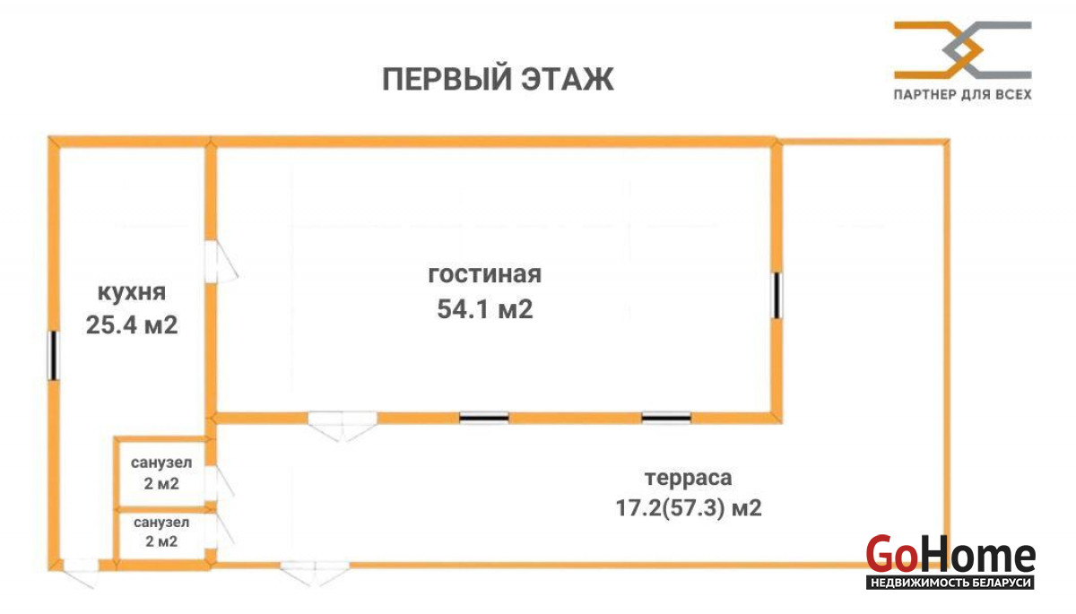 Год постройки – 2020. Этажность - 2 этажа.На первом этаже расположены: гостиная – 54,1 кв.м, кухня – 25,4 кв.м, два сан. узла, летняя терраса – 57,3 кв.м, застекленная двухкамерными стеклопакетами.