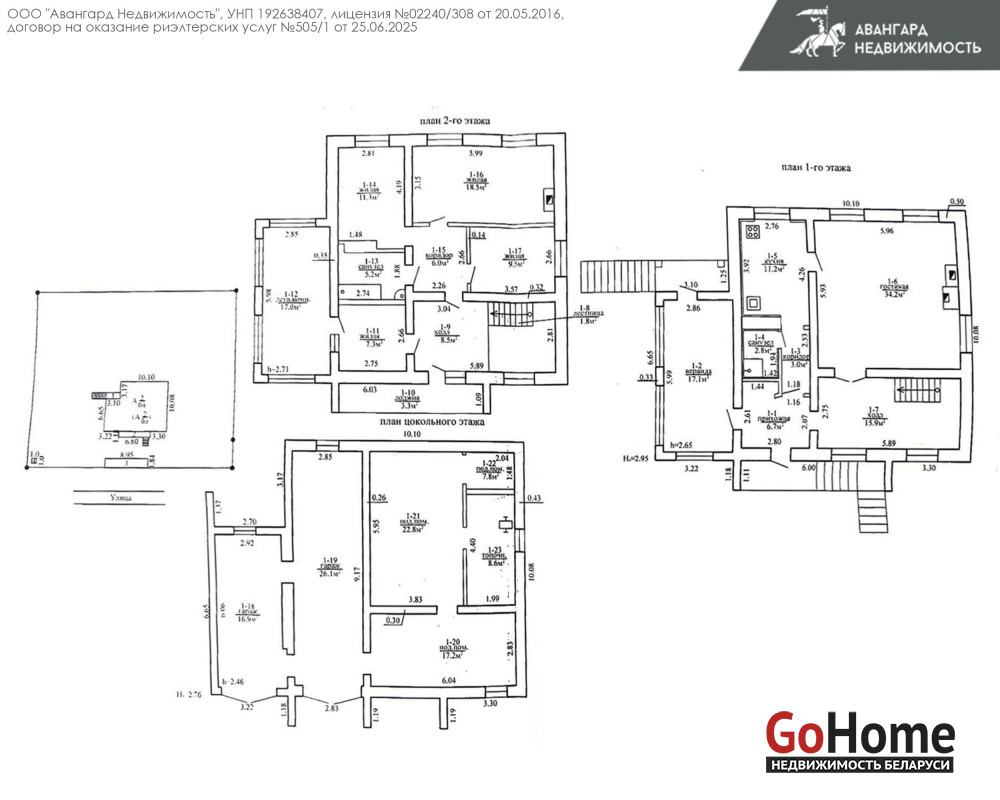 Цокольный этаж - два гаража с отдельными воротами (один длиной 9,17м, в него можно ставить две средние машины), много технических и подсобных помещений, топочная.