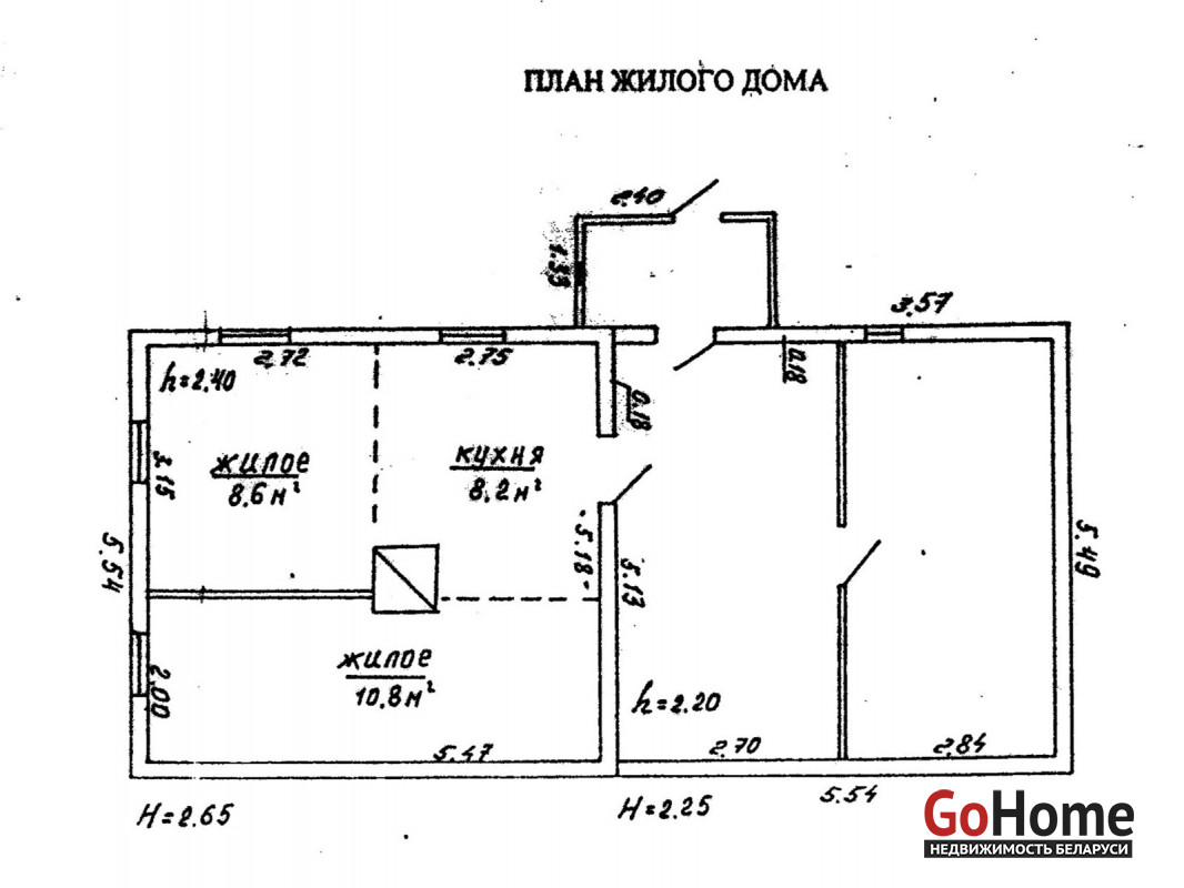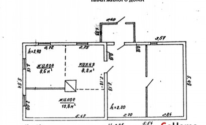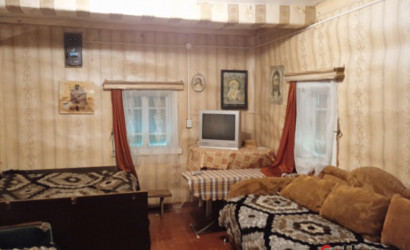 1 этажный бревенчатый дом с крышей из андулина, площадь общая 27.6м2, площадь жилая 19.4м2, площадь кухни 8.2м2.