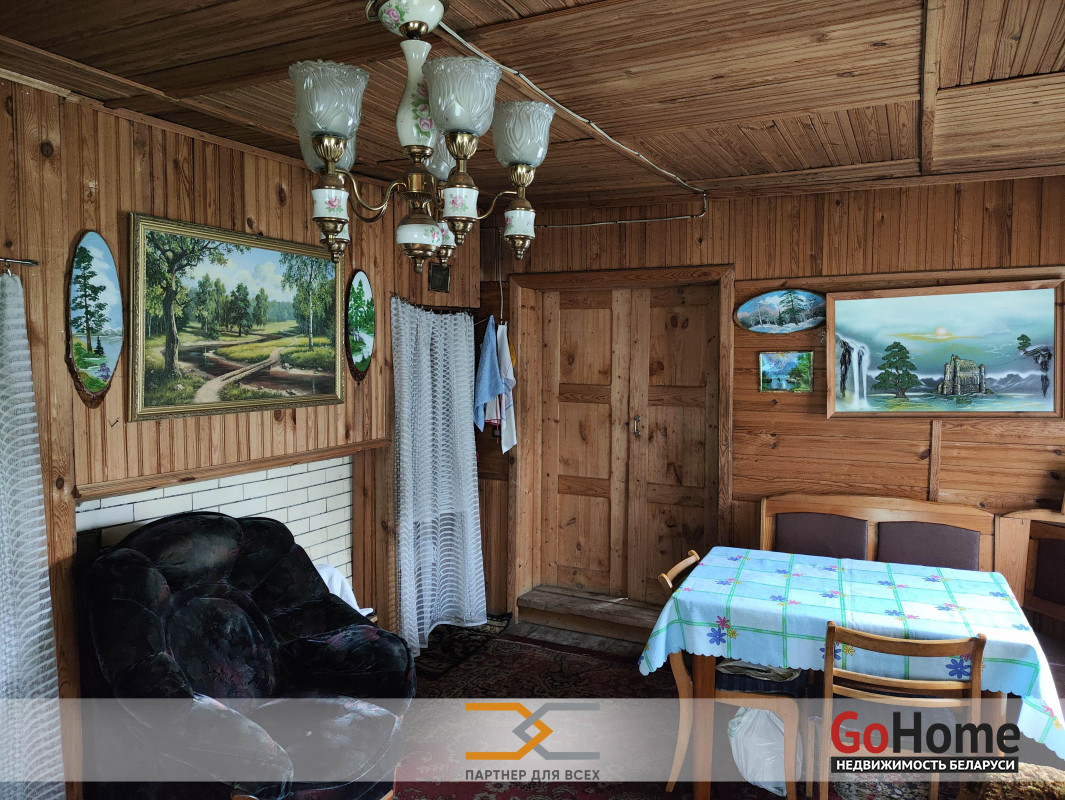 На первом этаже дома расположены веранда, комната с печкой, выделенное пространство для сна и отдыха. На полу доска. Стены и потолок отделаны вагонкой.