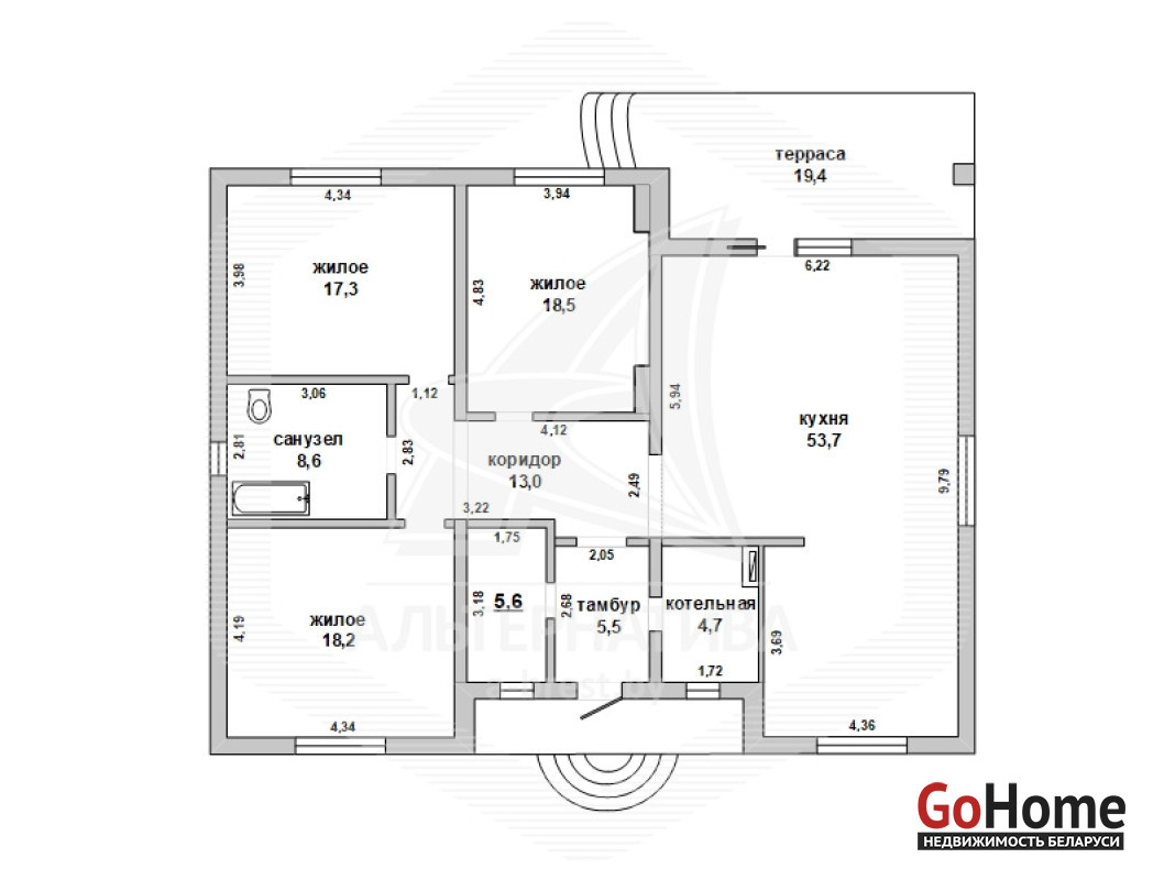 Жилой дом в Кобринском р-не. 2017 г.п. 1 этаж. Общ.СНБ - 150,9 кв.м, общ.- 145,1 кв.м, жил.- 54,0 кв.м, кух.- 53,7 кв.м. 3 комнаты, высота потолка - 2,75 м.