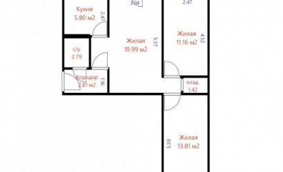 2-комнатная, 56.6/30.2/7.5 м2, Этаж 3 из 8