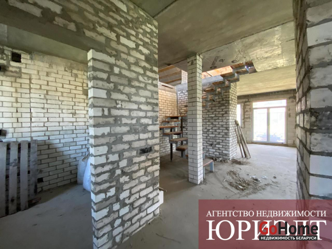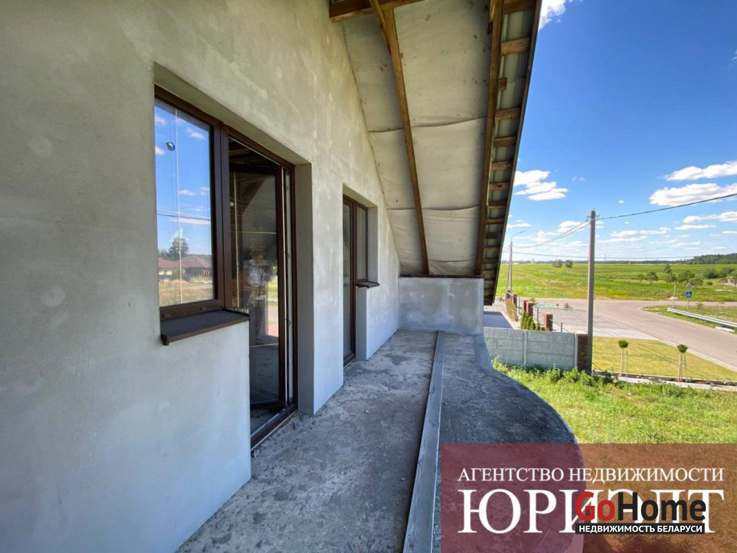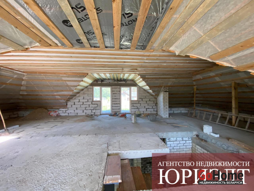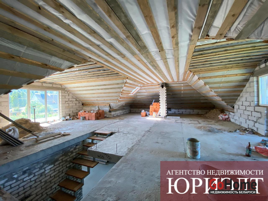 Стены – газосиликатные блоки 250 мм, утеплены в системе "Термошуба" пенопластом 100мм. Фасад дома подготовлен для дальнейшей отделки. Железобетонное перекрытие между первым и мансардным этажом. Окна ПВХ с двухсторонней ламинацией и шпросами во французском стиле. Окна-двери "в пол" для выхода на террасу и лоджии на мансарде. Металлический каркас лестницы, утепленные скаты, сложная металлочерепичная кровля.
