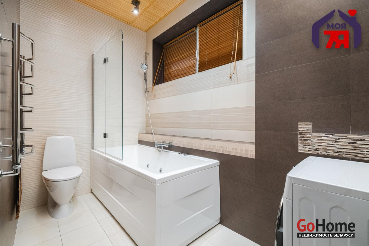 -Два санузла — удобство для семьи и гостей, с активной вентиляцией в обоих. В ванной установлена ванна с гидромассажем, стеклянная перегородка, качественная плитка с фактурным акцентом. Установлена стиральная машина.