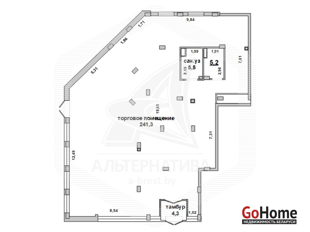 Торговое помещение в аренду в микрорайоне Юго - Запад (р - н ул. Мытной) города Бреста общей площадью 256,3 кв.м. Изолированное помещение с 2 (двумя) отдельными входами расположено на 1 (первом) этаже жилого дома 2024 года постройки. Без внутренней отделки. Зал площадью 241,3 кв.м, отдельный санузел (5,5 кв.м), подсобное помещение (5,2 кв.м), тамбур. Высота потолков - 3,77 м. Установлена пожарная сигнализация, приточно - вытяжная вентиляция, индивидуальные приборы учета электричества, водоснабжения и тепла. Парковка. Цена указана с НДС. Рассматриваются все варианты. Лот - 250035A