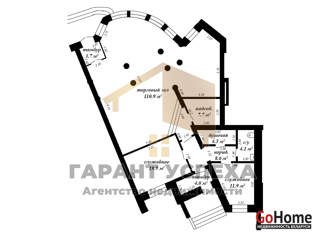 Общая площадь: 175,3 кв.м: торговый зал 110,9 кв.м, 2 отдельных кабинета (19,9 и 11,9 кв.м), подсобное помещение (7,7 кв.м), санузел (4,1 кв.м), душевая комната (4,5 кв.м).