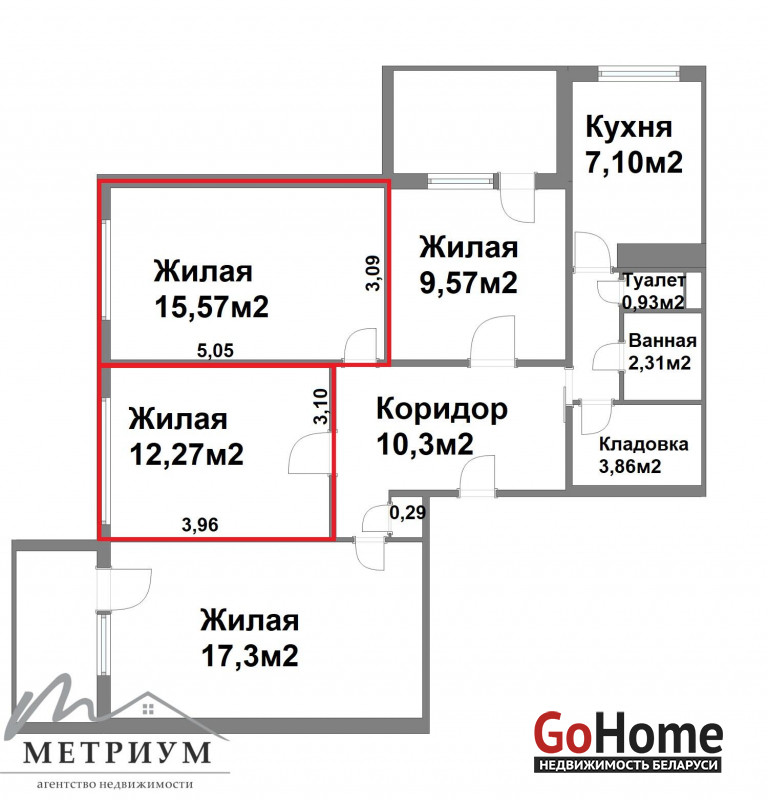 - уютные комнаты: 12,27м2 и 15,57м2