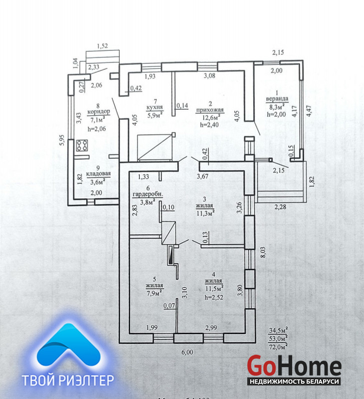 - стандартная планировка дома общей площадью 72 кв.м. с верандой;