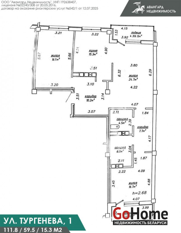 Площадь квартиры по СНБ 111.8 м2. Высота потолков составляет 2.68 м. Квартира с удобной планировкой: две изолированные жилые комнатами 16.7м2 и 16.1м2, одна с выходом на застеклённую видовую лоджию. Просторная кухня площадью 15.3м2 станет идеальным местом для семейных ужинов и встреч. Кухня-гостиная 24.7м2 с большим и удобном диваном, в квартире два комфортных санузла.