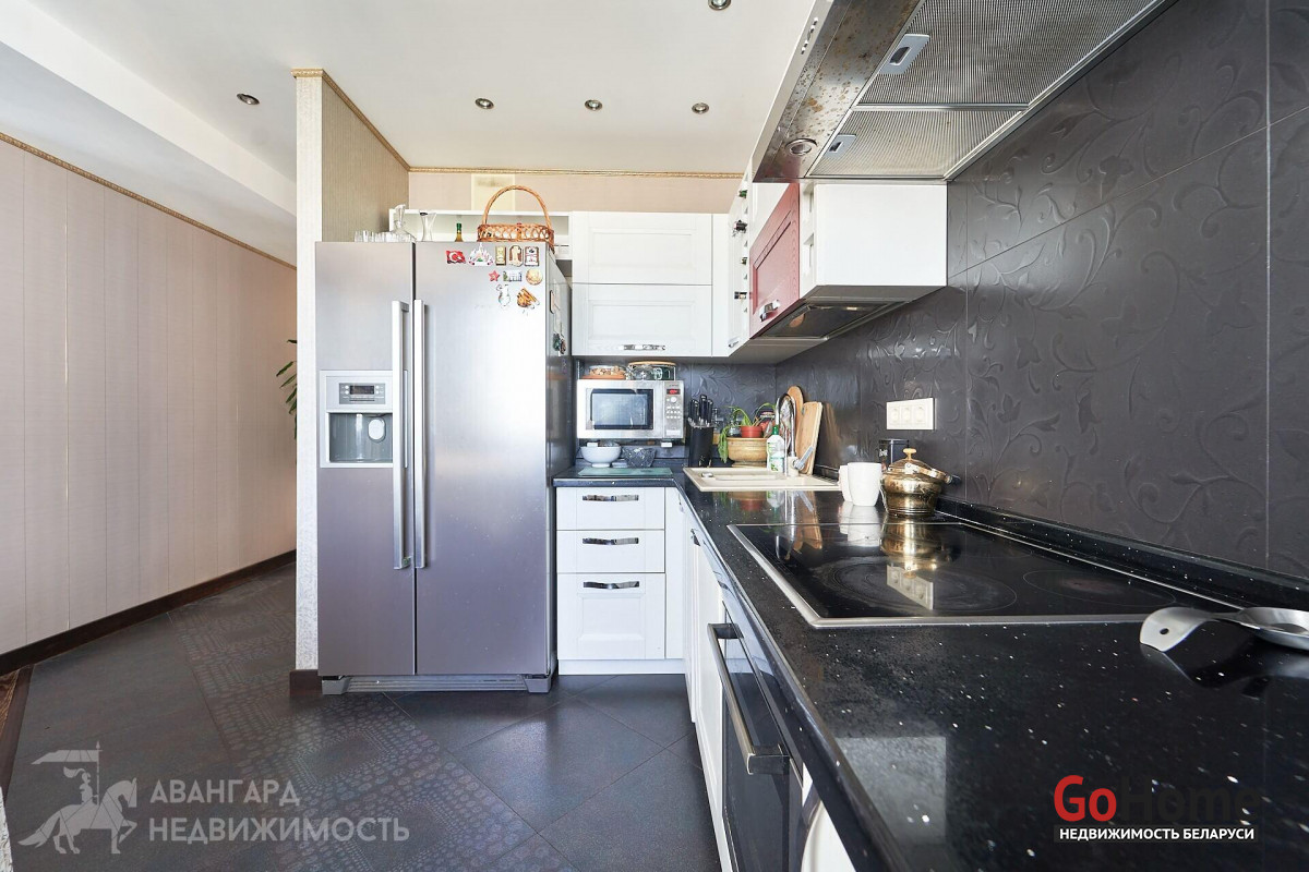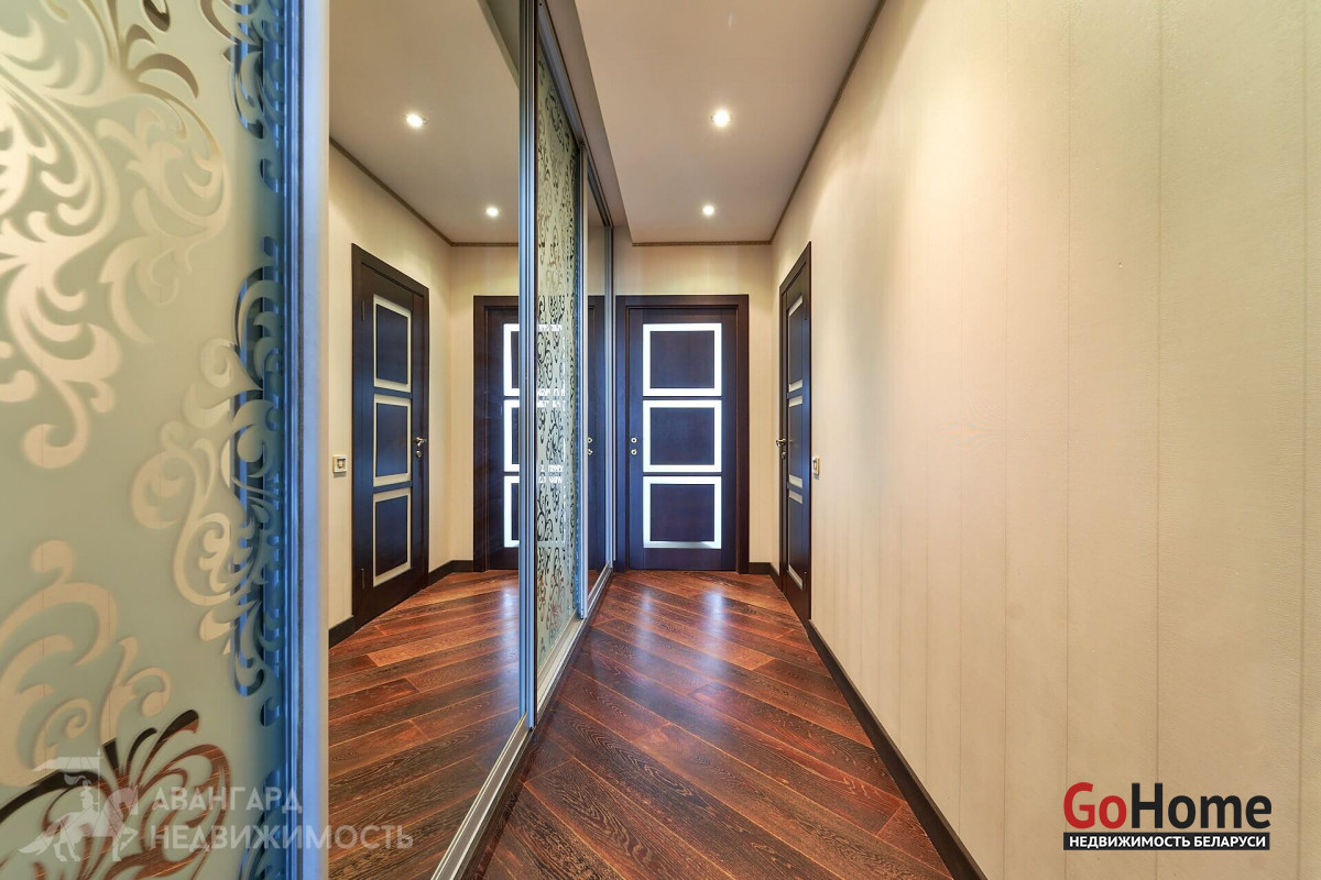 Кухняоснащена качественной встроенной техникой от ведущих компаний (варочная панель, духовой шкаф, посудомоечная машина, холодильник, фильтр воды). В коридоре вместительная гардеробная с удобной геометрией.