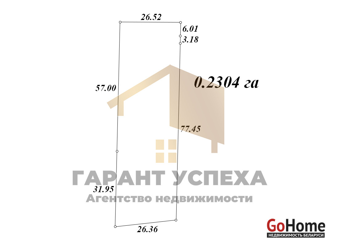 Участок прямоугольной формы, площадь 0,2304 га. Земля в ПНВ. Участок ровный, почва плодородная. Огорожен по периметру сеткой.