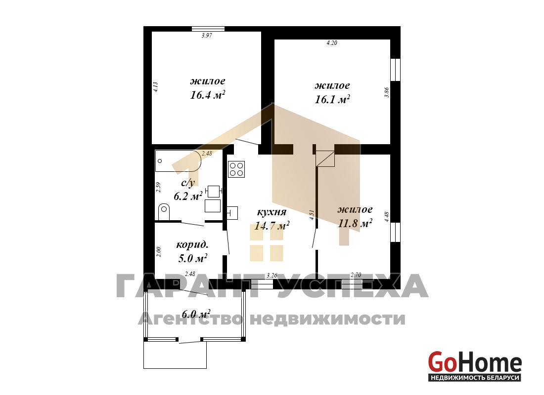 Общая площадь – 76,2/70,2 кв. м, жилая – 44,3 кв. м, кухня – 14,7 кв. м. Три изолированные жилые комнаты 11,8/16,1/16,4 кв. м. Веранда 6 кв. м.