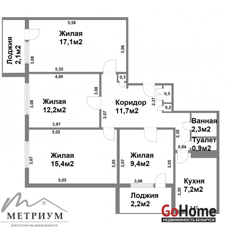 Комнаты - 17,1 м2 15,4 м2,12,2 м2, 9,4 м2.