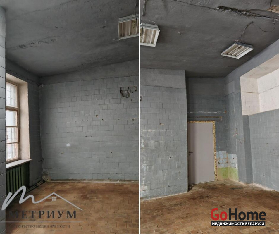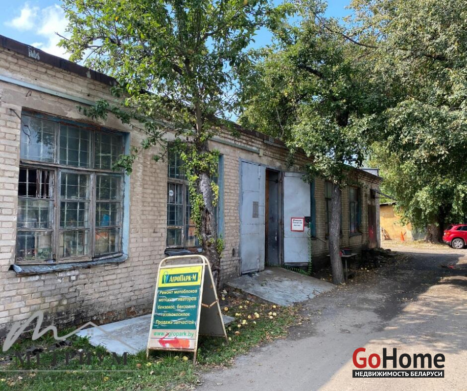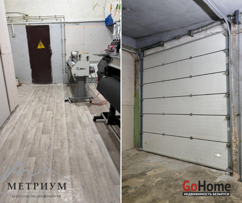 Ворота для въезда автомобиля внутрь. В помещении выполнена черновая отделка. Проведены все необходимые коммуникации, есть доступ к санузлу. Рядом со входом парковка для автомобилей.