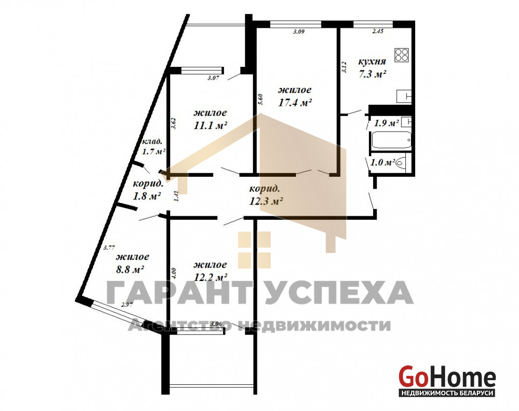 Общая площадь - 80,3 кв.м, жилая - 49,5 кв.м, кухня - 7,3 кв.м.