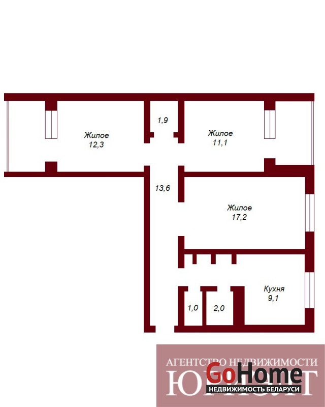 площадь кухни – 9,1 м².