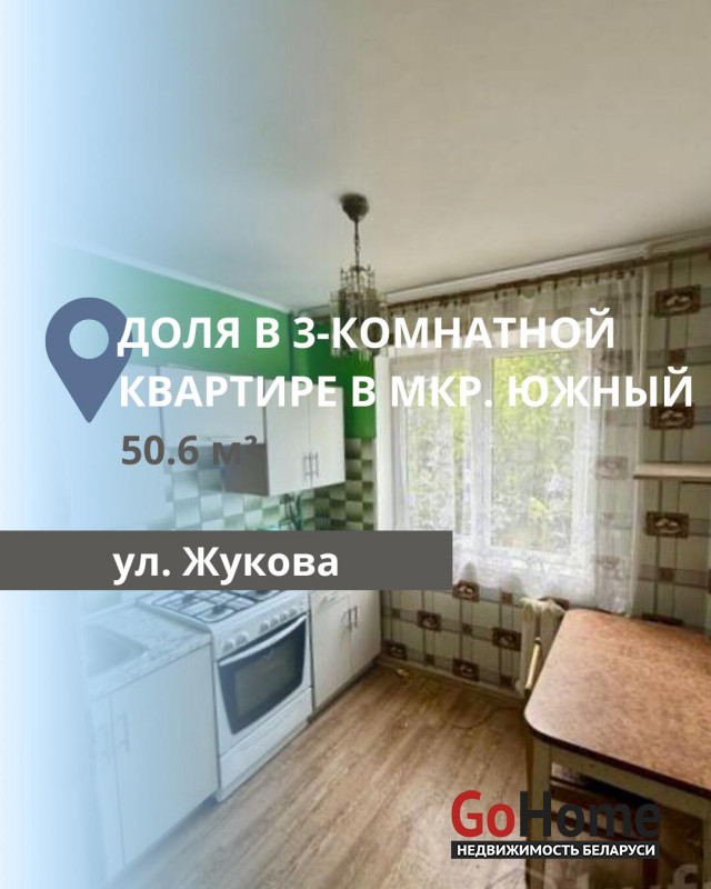 Продается доля в 3-комнатной квартире (379/500), расположенной по адресу: ул. Жукова, на 2 этаже 5-этажного панельного дома. Общая площадь квартиры составляет 50,6 м2, жилая — 34,3 м2, кухня — 5,2 м2. Квартира находится в жилом состоянии: установлены окна ПВХ, стены оклеены обоями, потолки отделаны снежкой. Санузел раздельный, также имеется подвал.