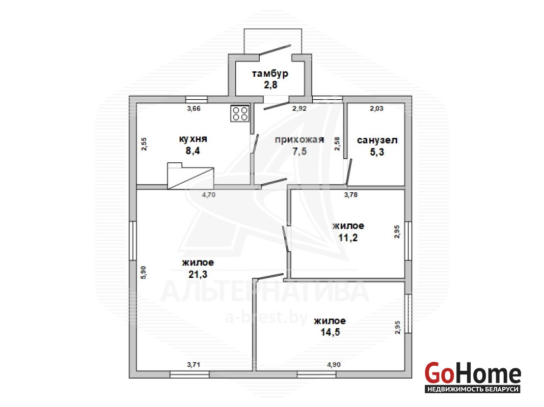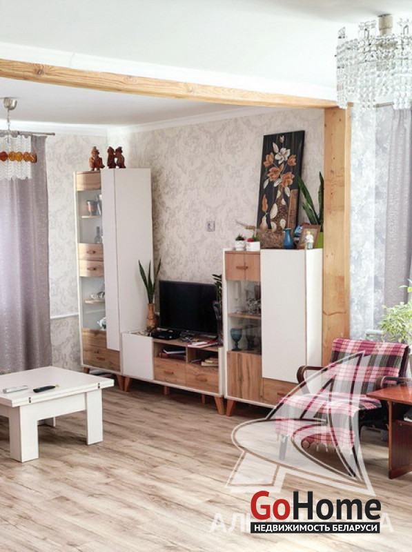 Жилой дом в Жабинковском р-не. 1 этаж. Общ.СНБ - 74,7 кв.м, общ.- 71,9 кв.м, жил.- 47,0 кв.м, кух.- 8,4 кв.м. 3 комнаты, высота потолка - 2,51 м.
