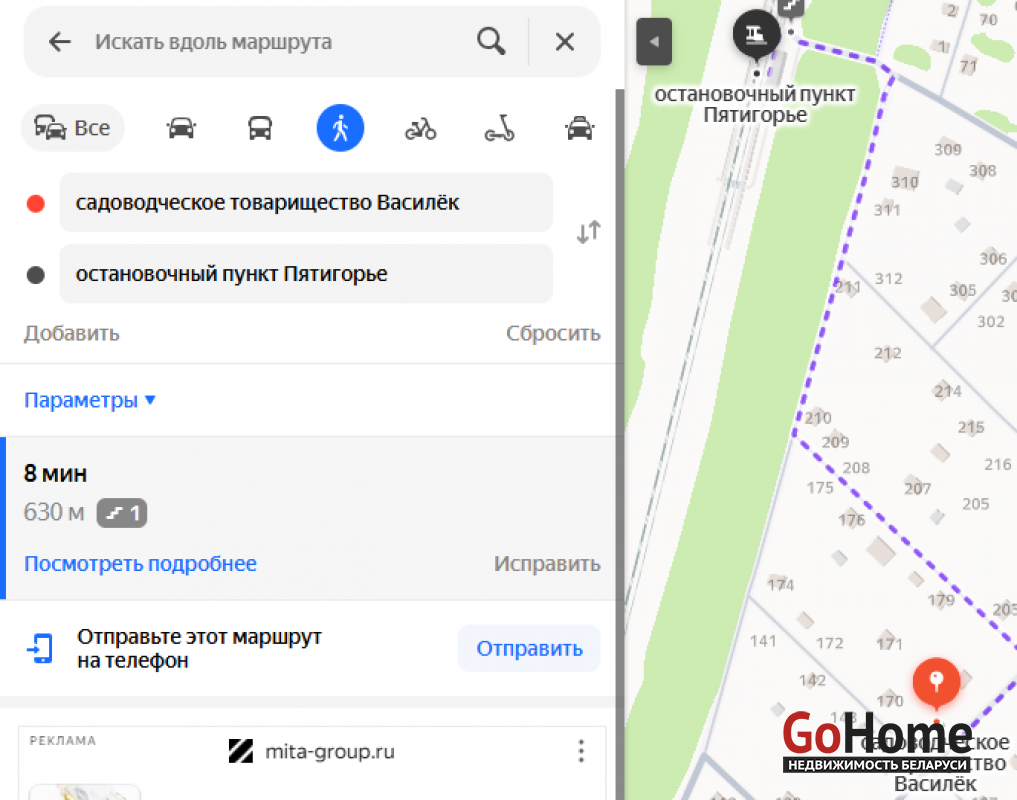 Электричка, остановка "Пятигорье", пешком 8 мин (630 м) до участка.