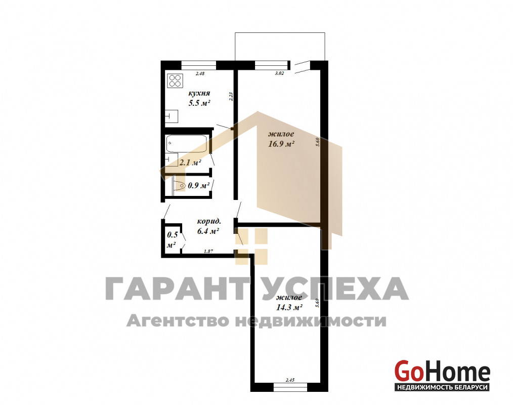 Общая площадь квартиры составляет 46,6 м² (по СНБ – 47,4 м²), жилая – 31,2 м², кухня – 5,5 м².