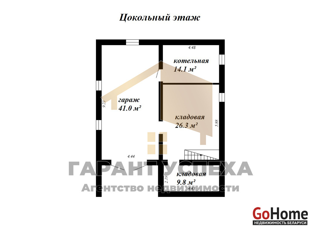 Гараж с высотой потолка в 2,3 м, отдельная котельная, прачечная и огромные кладовые в цоколе, площадь которого равна площади первого этажа.