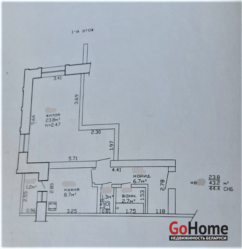 Общая площадь 44.4.м2.Большая комната 22,8м2 и кухня 8,7м2.