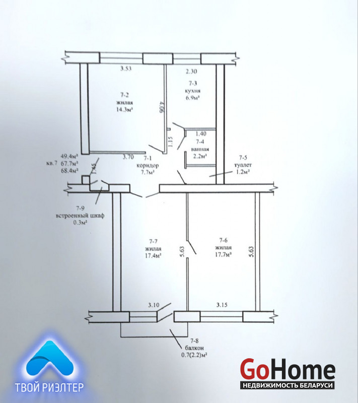 - стандартная планировка квартиры площадью 68,4 кв.м с балконом;