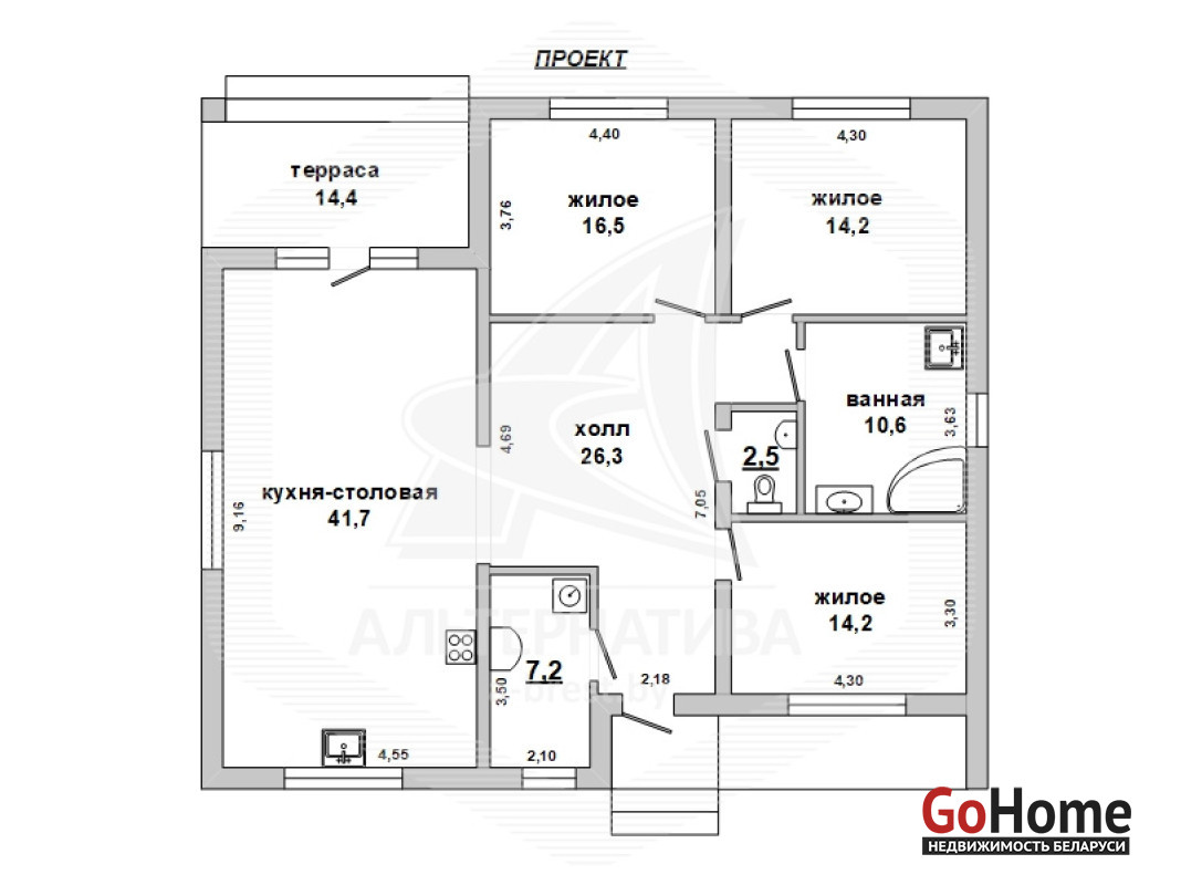 Жилой дом под чистовую отделку в Брестском р-не. 2025 г.п. 1 этаж. Общ.СНБ ~ 139,93 кв.м, общ.~ 135,5 кв.м, жил.~ 45,0 кв.м, кух.~ 41,6 кв.м. 3 комнаты, высота потолка - 2,80 м.